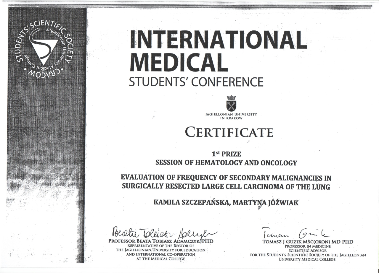 Kamila Szczepańska i Martyna Jóźwiak, 3rd year medical students from the Student Scientific Club at the MUG Department of Pathomorphology won 1st place in the Hematology & Oncology oral session at the International Medical Students’ Conference in Kraków on April 18-20th 2013. Students won for their research “Evaluation of frequency of secondary malignancies in surgically resected large cell carcinoma of the lung”, supervised by dr Piotr Czapiewski.