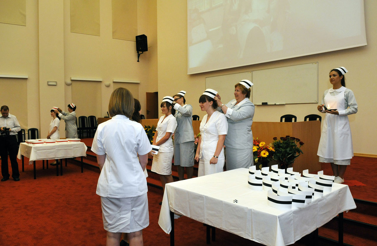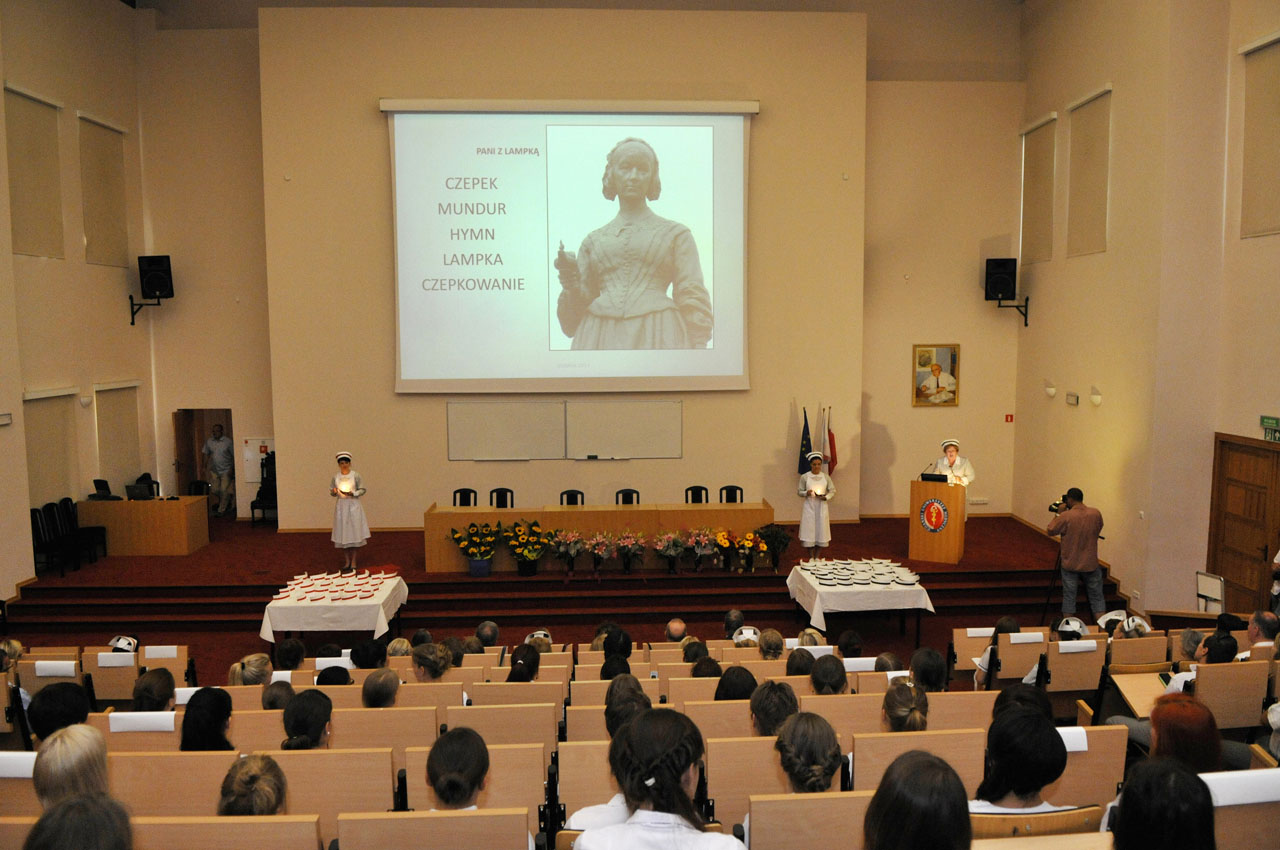 The traditional capping ceremony for the graduates of the nursing and midwife programs of the MUG Faculty of Health Sciences took place on June 21st 2013. The graduates, their families and friends, MUG authorities and staff as well as special guests (representatives of the local nursing and midwife chamber, the authorities and the University Clinical Centre authorities) gathered in the auditorium. Students wearing traditional clothing opened the ceremony by bringing lit candles to the auditorium, symbolizing the life entrusted to the care of nurses and midwifes. The ceremony was conducted by dr Janina Książek, Deputy Dean of the Subfaculty of Nursing. The caps worn by the graduates symbolize belonging to their new profession, service to people and obligation to maintain traditions of these beautiful yet difficult professions. The oath repeated by out loud by the graduates is an introduction to the Nurse and Midwife Code of Professional Ethics of the Republic of Poland. In addition, the graduates sang the Nursing Anthem.