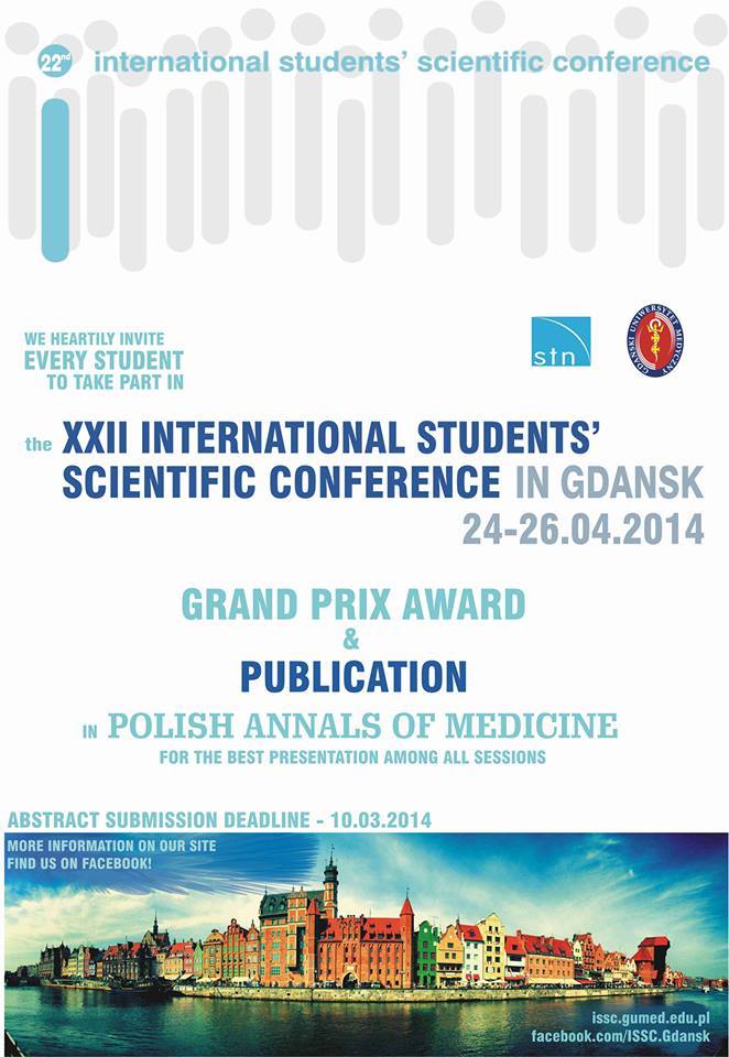 The MUG and the MUG Student Scientific Society (Studenckie Towarzystwo Naukowe GUMed) invite students and young doctors to present at the 22nd International Student Scientific Conference for Students and Young Doctors (ISSC). It will take place on April 24-26th 2014 on the MUG campus. The organizers planned 15 sessions (internal medicine, cardiology, pediatrics, surgery, orthopedics, gynecology, oncology, neurology, psychiatry, dermatology, dentistry, pharmacology, medical chemistry, public health) as well as a Case Report Session dedicated to the most interesting clinical cases. The best paper presented at this conference will be awarded the Grand Prix and will be published in the Polish Annals of Medicine.