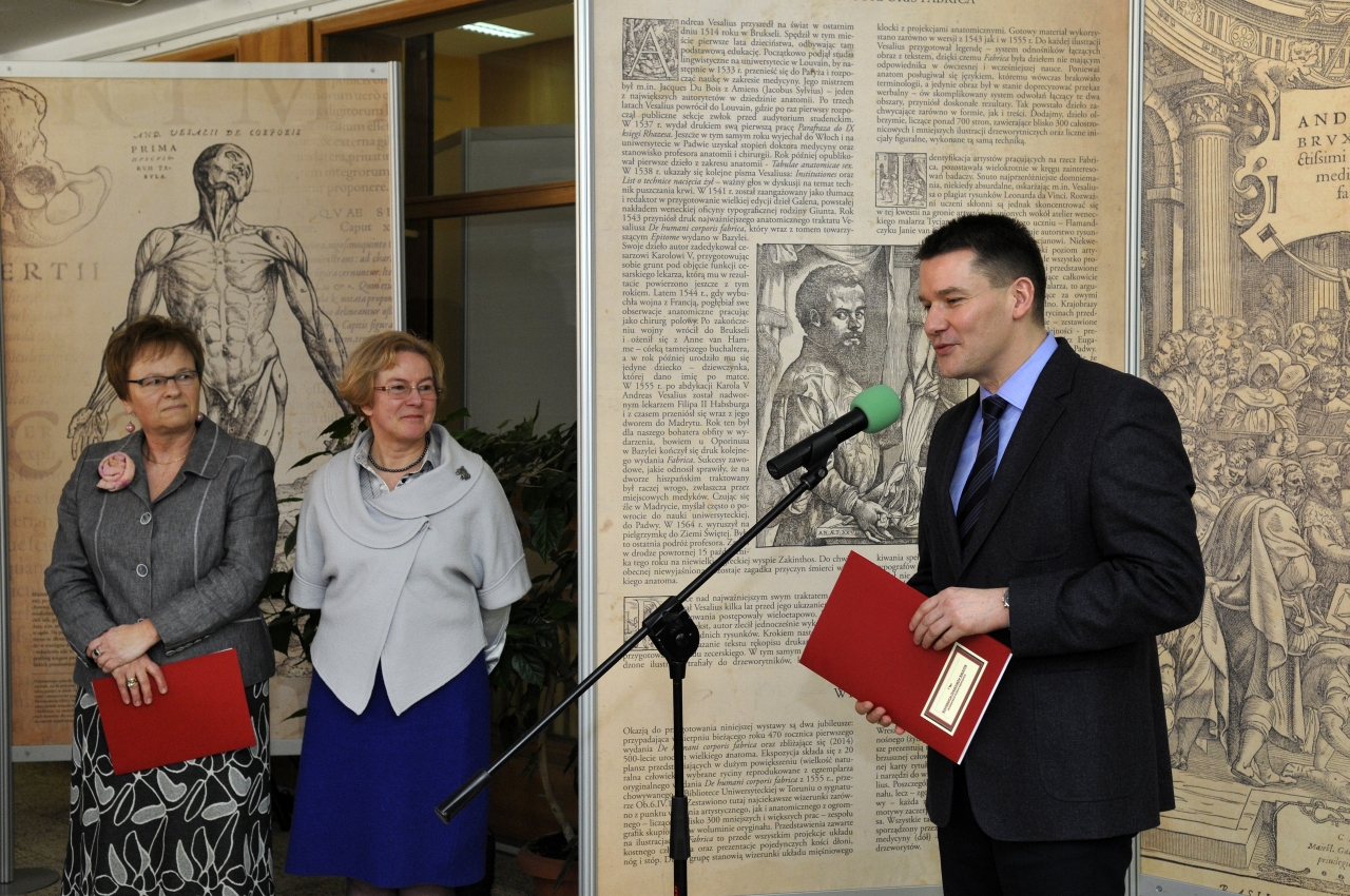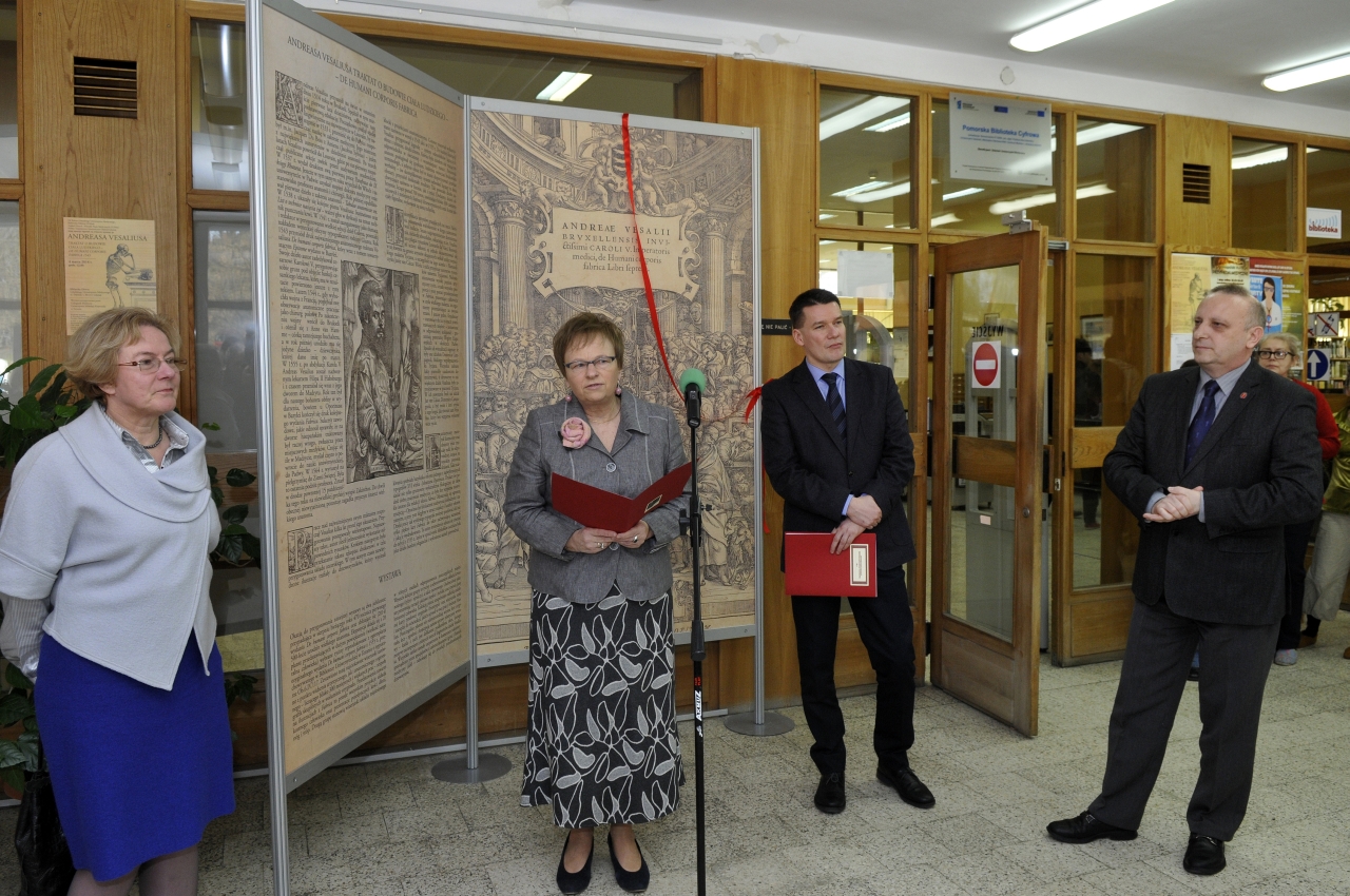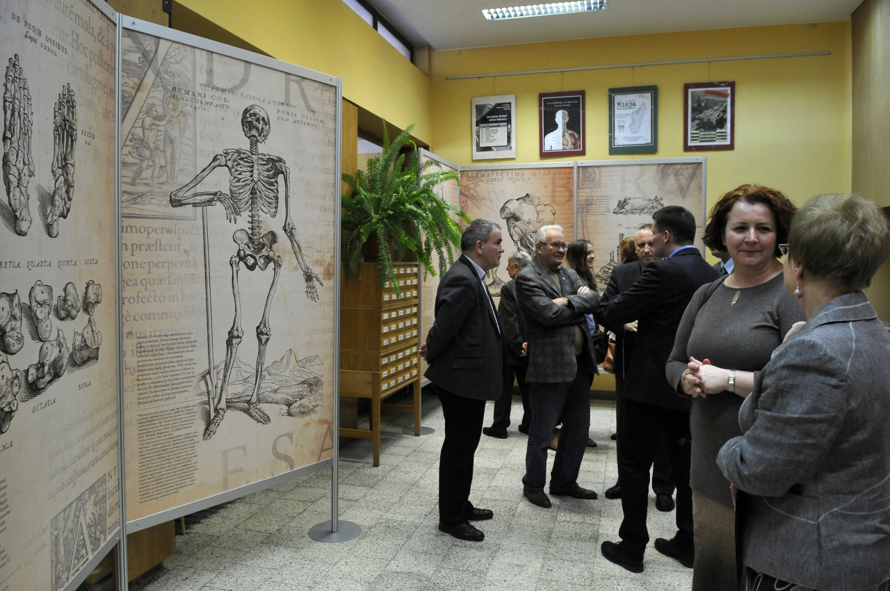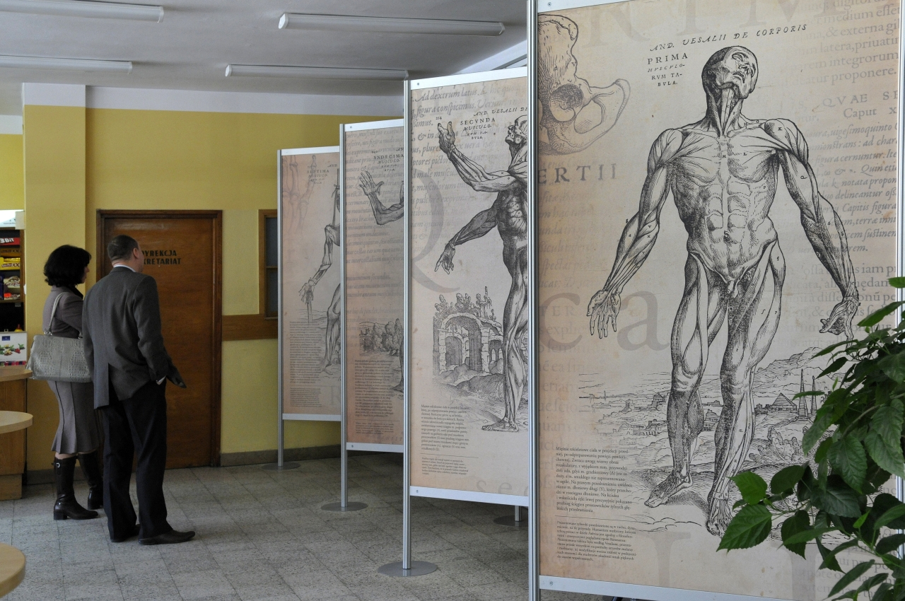 On March 4th 2014, the MUG Rector prof. Janusz Moryś officially opened the exhibition of anatomic drawings “Andreas Vesalius’ Treatise on the structure of human body – De humani corporis fabrica.” Vesalius created this work in the renaissance period and today it is regarded as a masterpiece of medical artwork and typography. The displays of Vesalius’ art were created by the staff of Collegium Medicum of the Nicolaus Copernicus University in Toruń. Dr Krzysztof Nierzwicki, director of the NCU Library as well as the originator and co-creator of this exhibition, gave a brief presentation about Vesalius’ life and the history behind his masterpiece. Among the visitors were representatives of the MUG authorities, directors of the Tricity universities’ libraries, MUG staff and students. The life-size illustrations with modern commentary caught the attention of the visitors. Also featured is a copy of “De humani corporis fabrica” from the 1930’s, presented in a display case in the Library’s catalog hall.