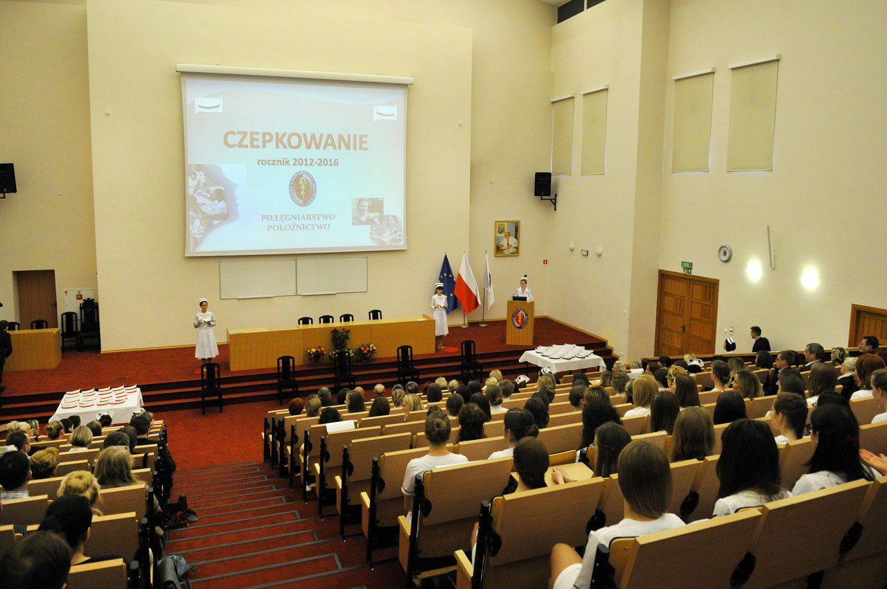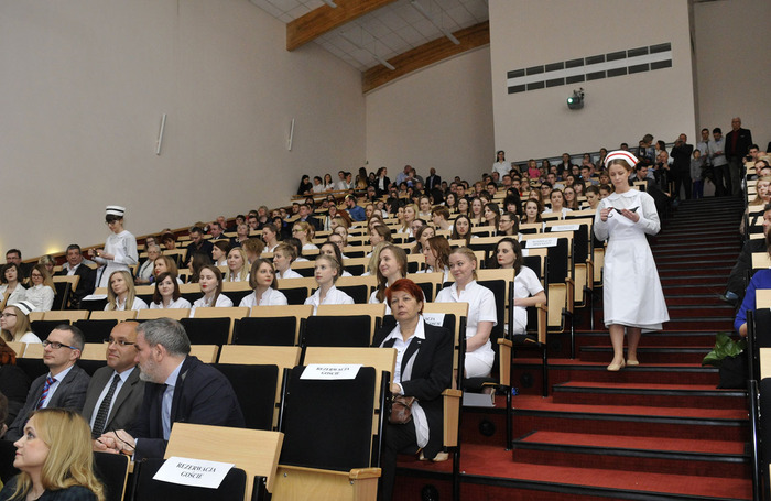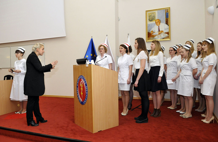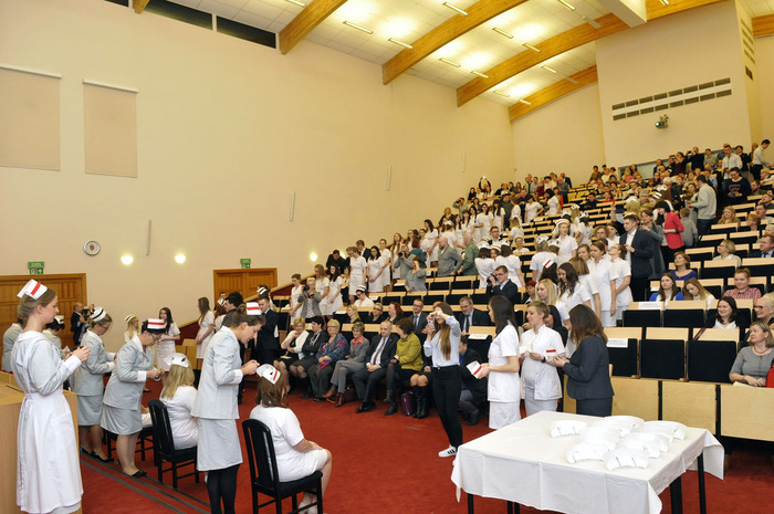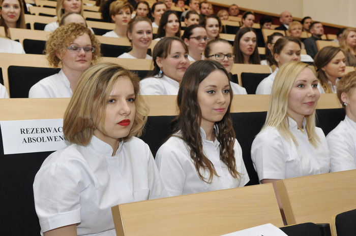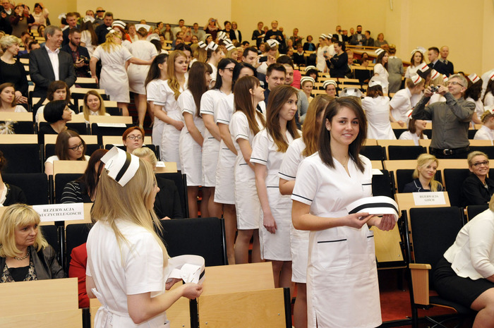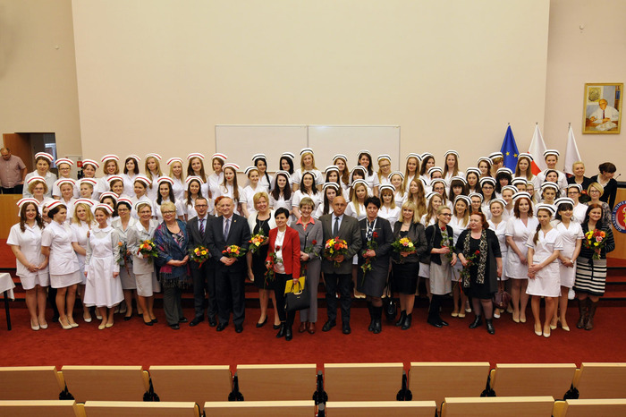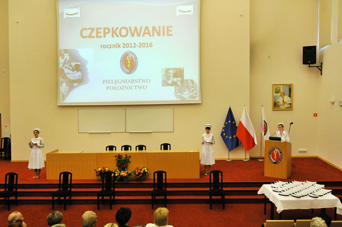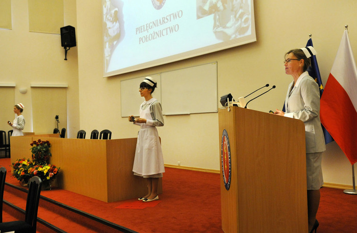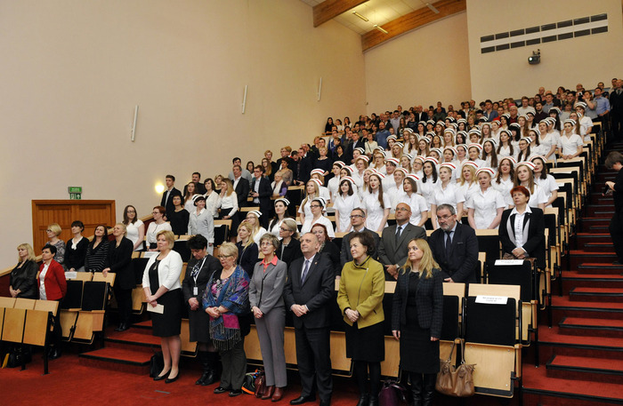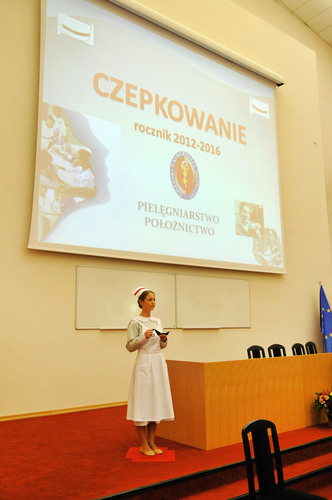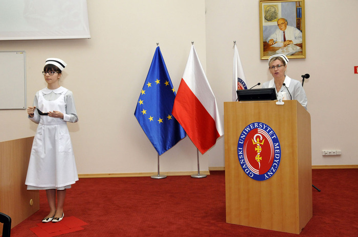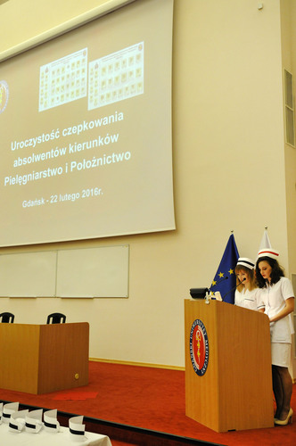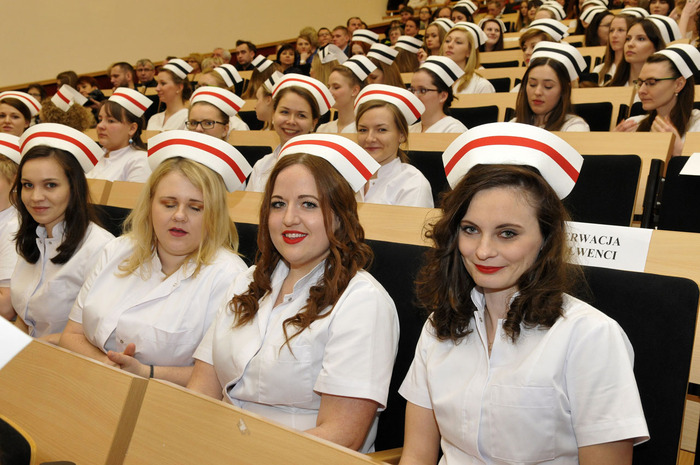 The traditional capping ceremony for the graduates of the nursing and midwife programs of the MUG Faculty of Health Sciences took place on June 22st 2016. The graduates, their families and friends, MUG authorities and staff as well as special guests (representatives of the local nursing and midwife chamber, the authorities and the University Clinical Centre authorities) gathered in the auditorium. Students wearing traditional clothing opened the ceremony by bringing lit candles to the auditorium, symbolizing the life entrusted to the care of nurses and midwifes. The ceremony was conducted by dr hab. n. med. Aleksandra Gaworska-Krzemińska , Haed of the Subfaculty of Nursing. The caps worn by the graduates symbolize belonging to their new profession, service to people and obligation to maintain traditions of these beautiful yet difficult professions. The oath repeated by out loud by the graduates is an introduction to the Nurse and Midwife Code of Professional Ethics of the Republic of Poland. In addition, the graduates sang the Nursing Anthem. The ceremony ended thanks Graduates speech prof. Janusz Moryś and invited guests. After them were made commemorative photos, which will be a memento of the event.