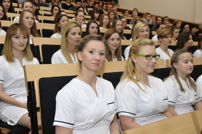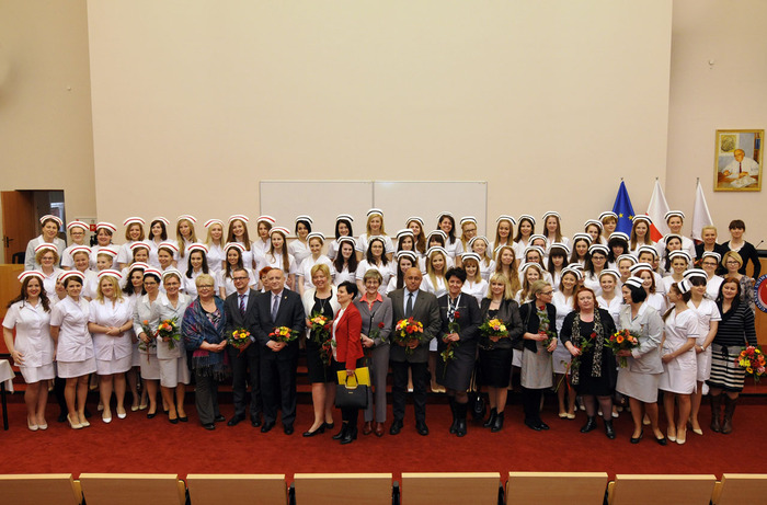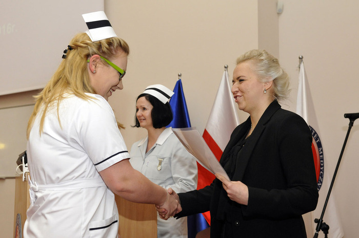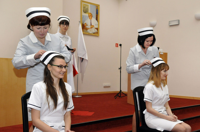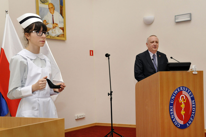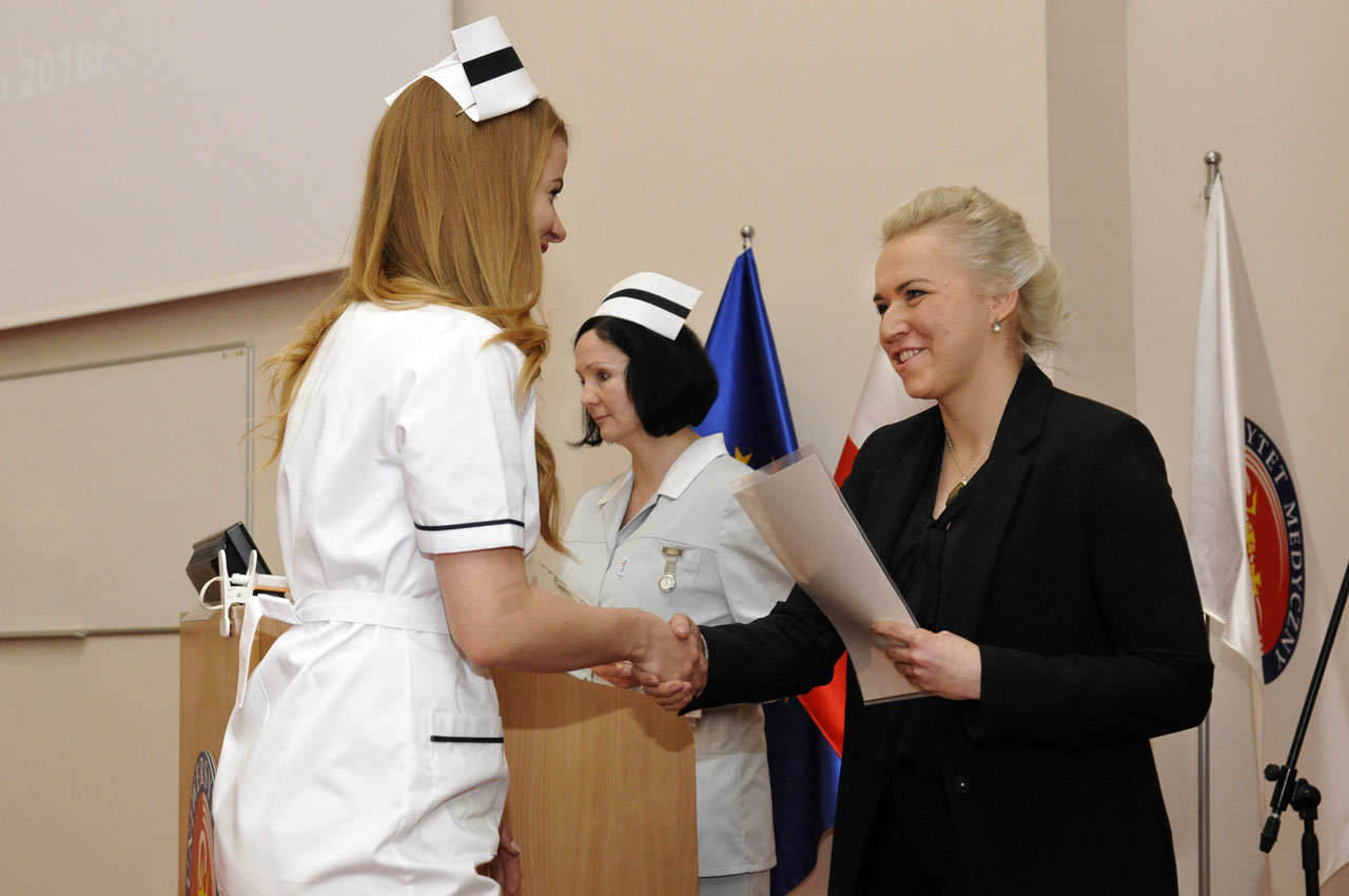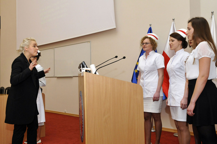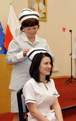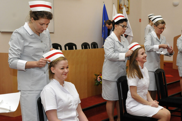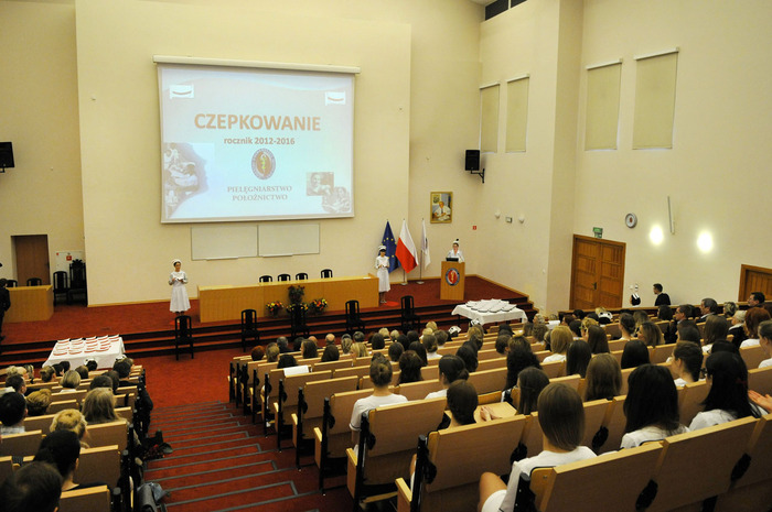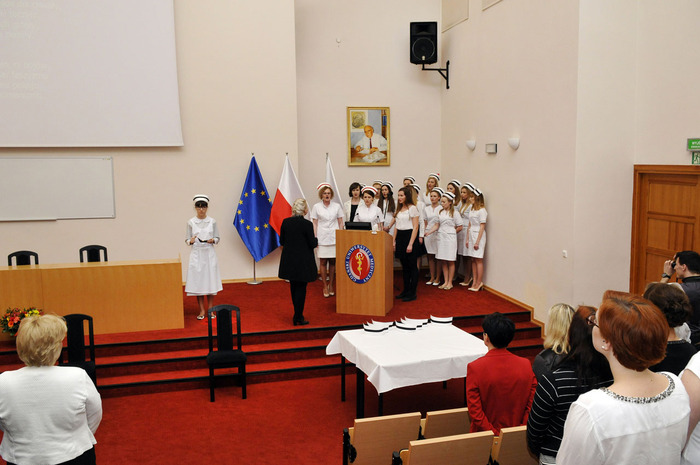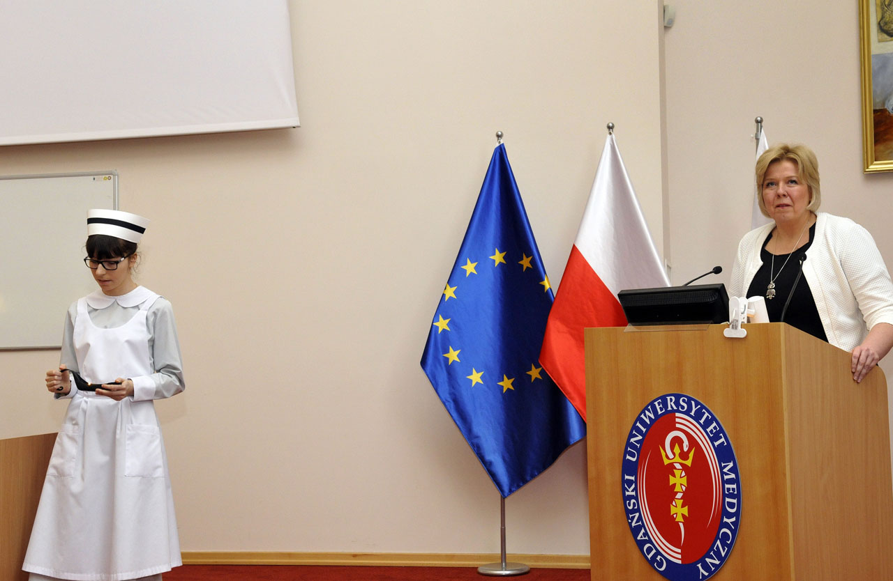 The traditional capping ceremony for the graduates of the nursing and midwife programs of the MUG Faculty of Health Sciences took place on June 22st 2016. The graduates, their families and friends, MUG authorities and staff as well as special guests (representatives of the local nursing and midwife chamber, the authorities and the University Clinical Centre authorities) gathered in the auditorium. Students wearing traditional clothing opened the ceremony by bringing lit candles to the auditorium, symbolizing the life entrusted to the care of nurses and midwifes. The ceremony was conducted by dr hab. n. med. Aleksandra Gaworska-Krzemińska , Haed of the Subfaculty of Nursing. The caps worn by the graduates symbolize belonging to their new profession, service to people and obligation to maintain traditions of these beautiful yet difficult professions. The oath repeated by out loud by the graduates is an introduction to the Nurse and Midwife Code of Professional Ethics of the Republic of Poland. In addition, the graduates sang the Nursing Anthem. The ceremony ended thanks Graduates speech prof. Janusz Moryś and invited guests. After them were made commemorative photos, which will be a memento of the event.
