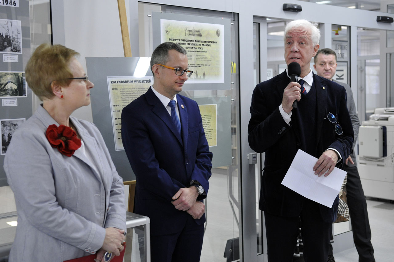 The opening ceremony of the exhibition in the Main Library was held on the 6th February. Guests were welcomed by Anna Grygorowicz, the library director, prof. Marcin Gruchała, the MUG rector and prof. Janusz Limon, who organised the exhibition. Among visitors were former rectors – prof. Barbara Krupa-Wojciechowska, prof. Zdzisław Wajda, prof. Wieslaw Makarewicz, prof. Roman Kaliszan and prof. Janusz Moryś, as well as representatives of the MUG authorities – prof. Jacek Bigda, prof. Tomasz Smiatacz and chancellor Marek Langowski.