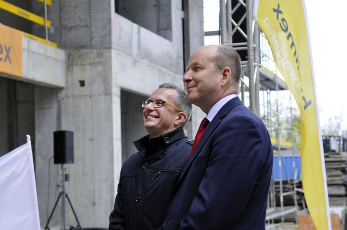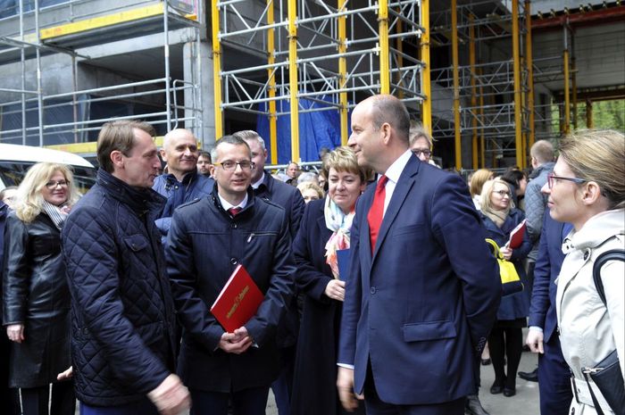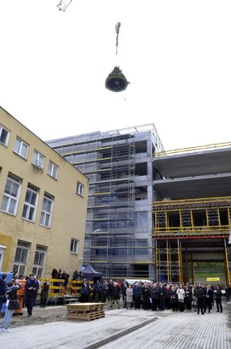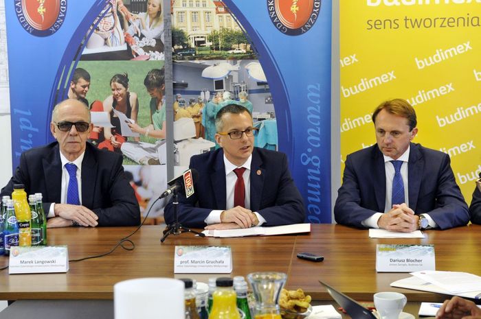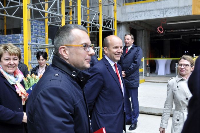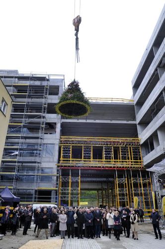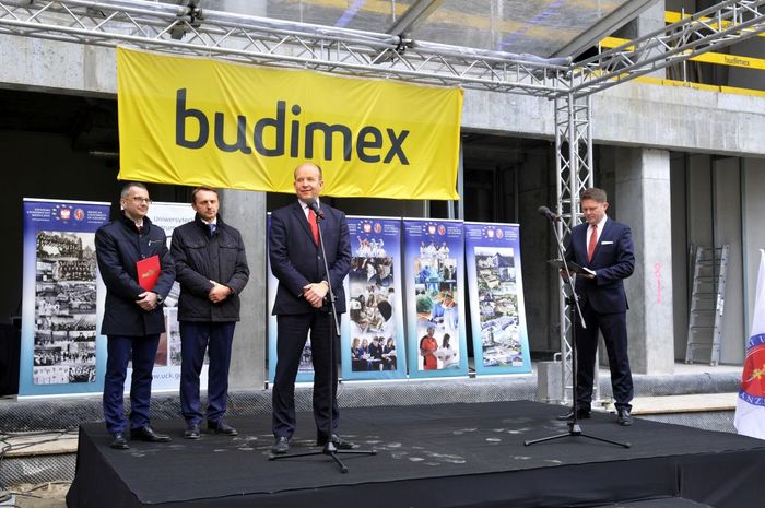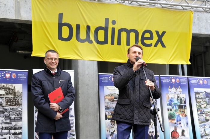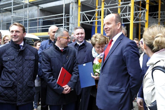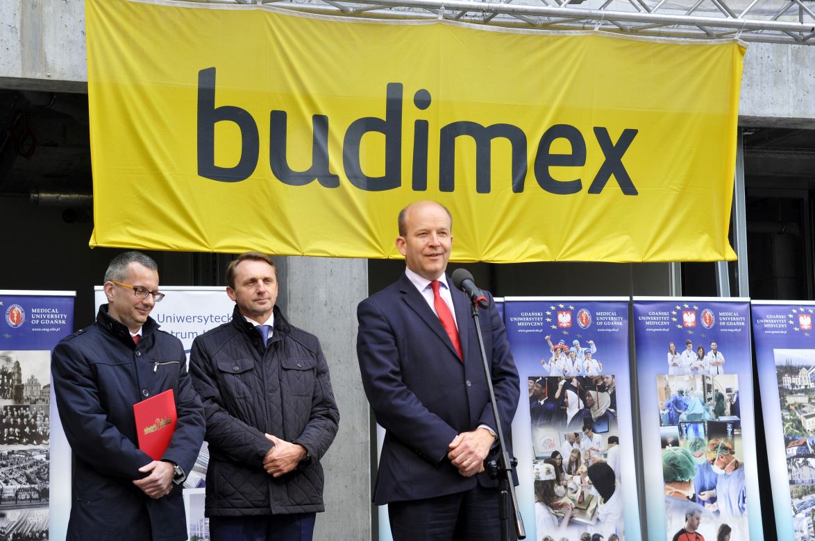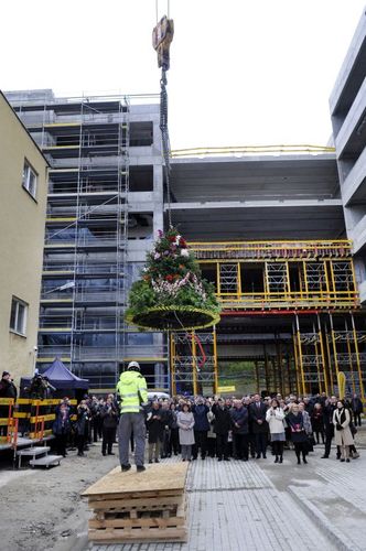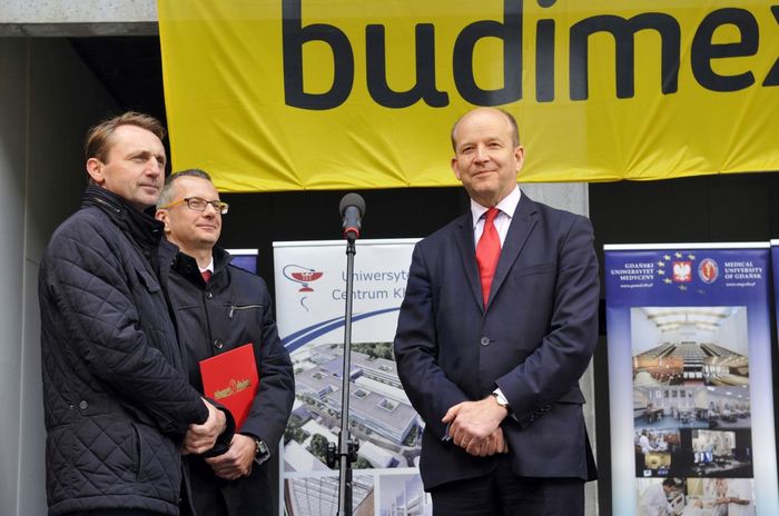 The construction of the MUG’s Non-Invasive Medicine Centre has reached the stage when the last beam has been placed atop its structure. The ceremony of topping out took place on the 8th of May at Smoluchowskiego street, on the hospital territory. The MUG’s Rector prof. Marcin Gruchała participated in the event together with Minister of Health Konstanty Radziwiłł, Deputy Marshal of Senate Bogdan Borusewicz, Secretary of State in the Ministry of Infrastructure and Construction Kazimierz Smoliński, Under-Secretary of State in the Ministry of Health Katarzyna Głowala, as well as representatives of Pomerania authorities, Budimex the general contractor, and Arch-Deco studio from Gdynia that created the investment project. The ceremony was preceded by a press conference.