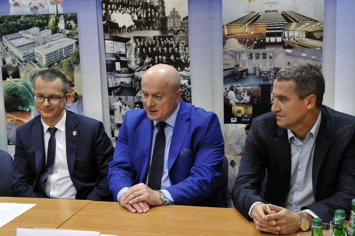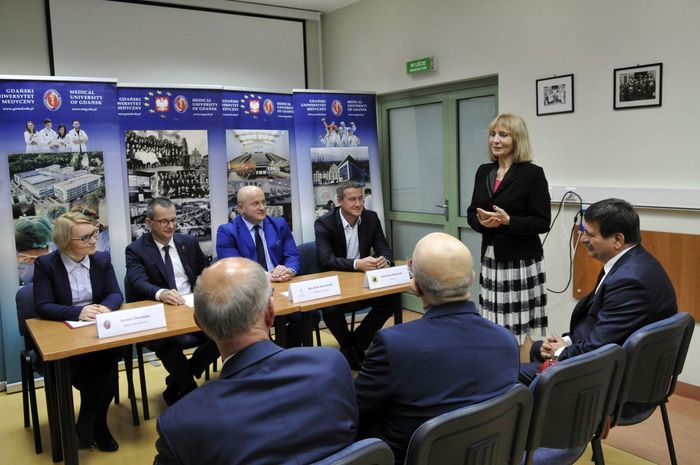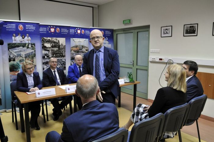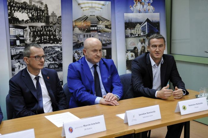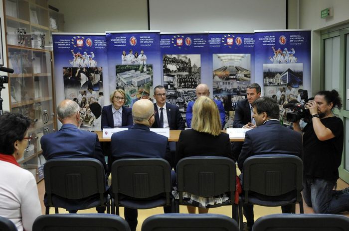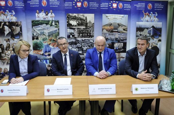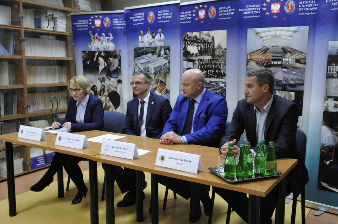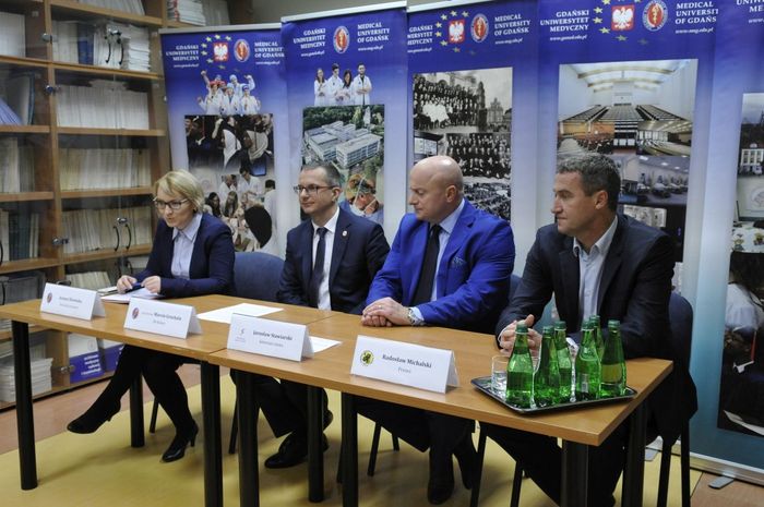 Rector of the Medical University of Gdańsk, prof. Marcin Gruchała, secretary of state in the Ministry of Sport and Tourism Jarosław Stawiarski, president of the Pomeranian Football Association Radosław Michalski, chancellor Marek Langowski, head of the Department of Physical Education and Sports Anna Kubicka, as well as members of the Polish Parliament Grzegorz Raczak and Janusz Śniadek took part in a press conference dedicated to the construction of the MUG’s Sports Centre. In 2017-2018, the University will receive 7 200 000 PLN from the Fund for Development of Physical Culture. The estimated cost of the investment is 19 000 000 PLN, the strategic partner of which is the Pomeranian Football Association. The Sports Centre will be built on the plot at 21 Dębowa street in Gdańsk. The building will include a sports arena of 1100 m2 with futsal, handball, basketball and volleyball courts, as well as aerobics, squash, martial arts and wrestling halls. The facility also features a tribune with 748 seats, 2 changing rooms for men and women (including disabled), underground garage with 103 parking spaces and bike stands for 22 bicycles. The construction works have commenced on July 18th and a planned date of completion is July 31st, 2018. The authors of the project is Archimedia, the architecture office from Poznań and a contractor is Przembud SA, Gdańsk-based company.