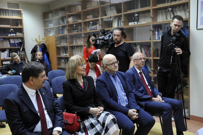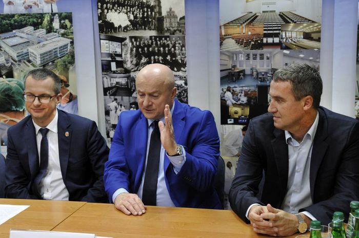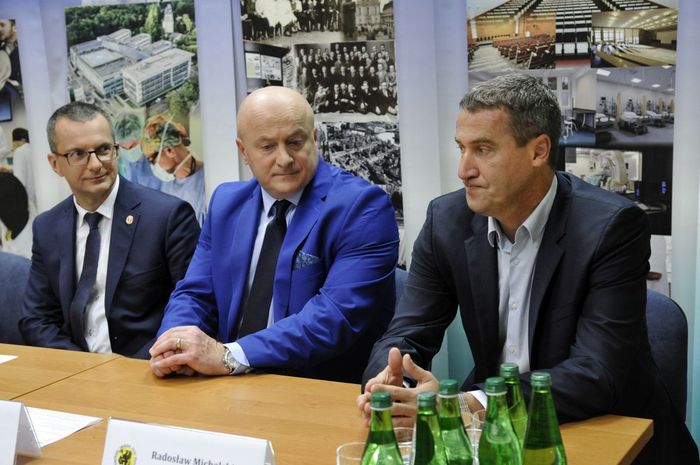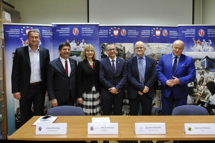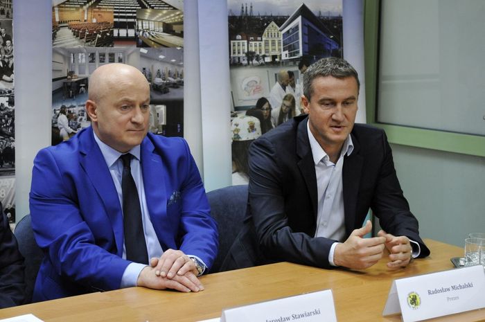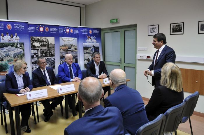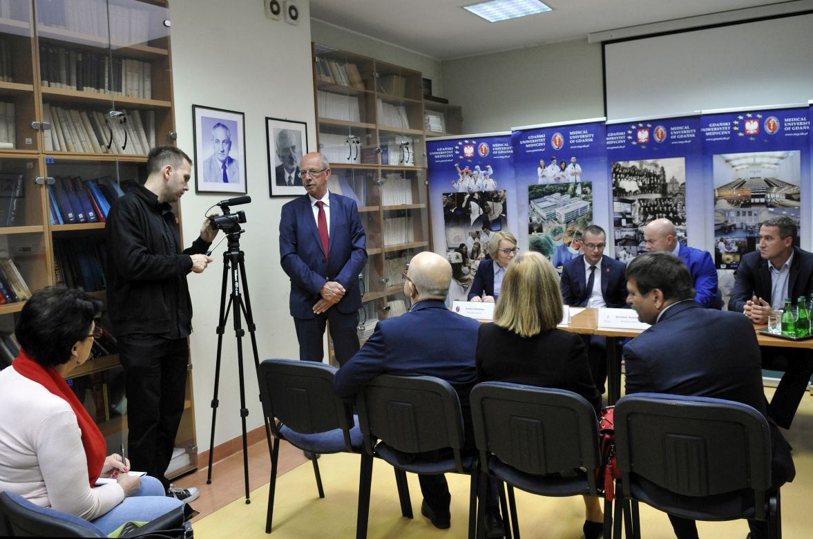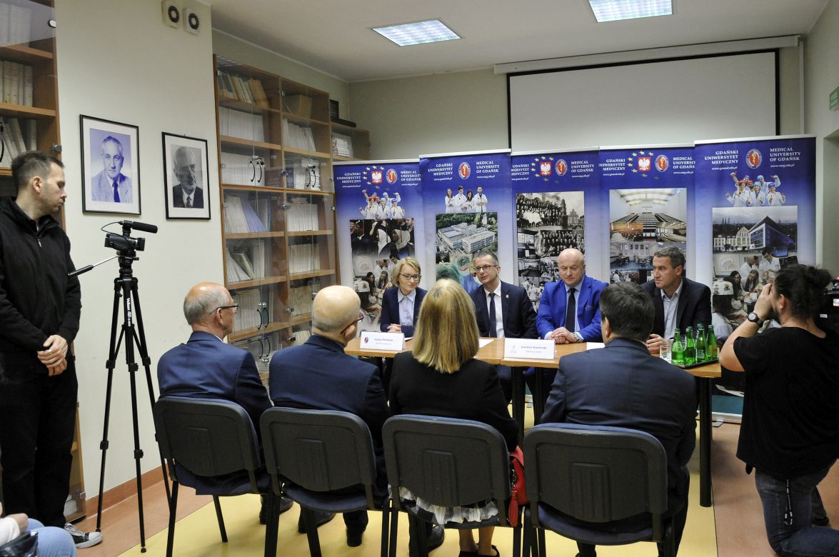 Rector of the Medical University of Gdańsk, prof. Marcin Gruchała, secretary of state in the Ministry of Sport and Tourism Jarosław Stawiarski, president of the Pomeranian Football Association Radosław Michalski, chancellor Marek Langowski, head of the Department of Physical Education and Sports Anna Kubicka, as well as members of the Polish Parliament Grzegorz Raczak and Janusz Śniadek took part in a press conference dedicated to the construction of the MUG’s Sports Centre. In 2017-2018, the University will receive 7 200 000 PLN from the Fund for Development of Physical Culture. The estimated cost of the investment is 19 000 000 PLN, the strategic partner of which is the Pomeranian Football Association. The Sports Centre will be built on the plot at 21 Dębowa street in Gdańsk. The building will include a sports arena of 1100 m2 with futsal, handball, basketball and volleyball courts, as well as aerobics, squash, martial arts and wrestling halls. The facility also features a tribune with 748 seats, 2 changing rooms for men and women (including disabled), underground garage with 103 parking spaces and bike stands for 22 bicycles. The construction works have commenced on July 18th and a planned date of completion is July 31st, 2018. The authors of the project is Archimedia, the architecture office from Poznań and a contractor is Przembud SA, Gdańsk-based company.
