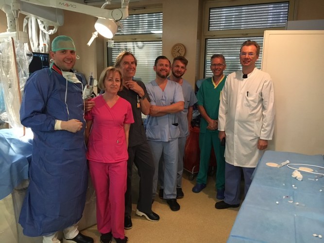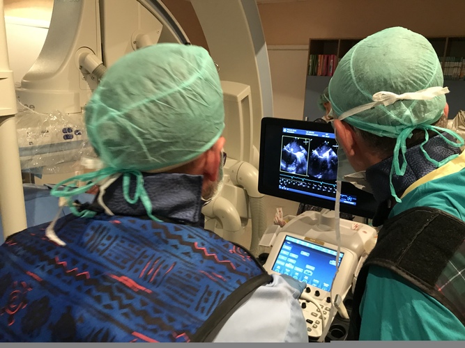 The first in the northern part of Poland transcatheter non-surgical mitral valve repair (MitraClip, Abbott) was carried out on May 8th this year in the 1st Department of Cardiology in the UCC headed by acting prof. Grzegorz Raczak. The patient was a 57-year-old man with severe mitral regurgitation. The surgery in the Invasive Cardiology Laboratory room was conducted by Michał Chmielecki M.D. Ph.D. and Dariusz Ciećwierz M.D. Ph.D. Transesophageal echocardiography during the procedure was conducted by Rafał Gałąska M.D. Ph.D. and prof. Marcin Fijałkowski M.D. Ph.D. Substantive support during the surgery was provided by prof. Piotr Szymański from the Institute of Cardiology in Warsaw. Anna Dylczyk-Sommer M.D. Ph.D. was responsible for the patient’s anesthesia.