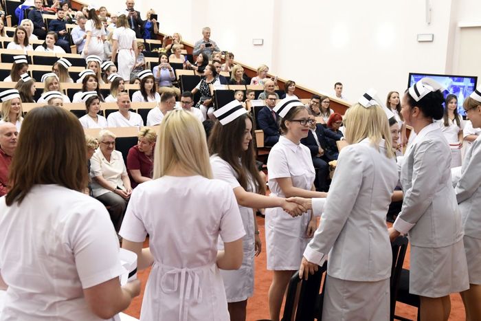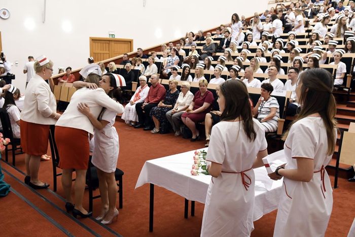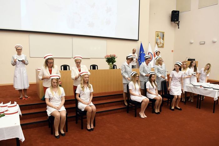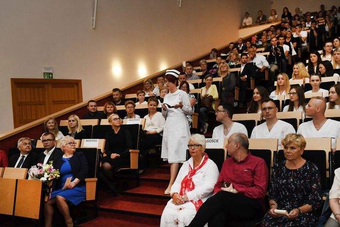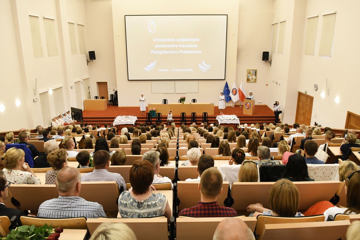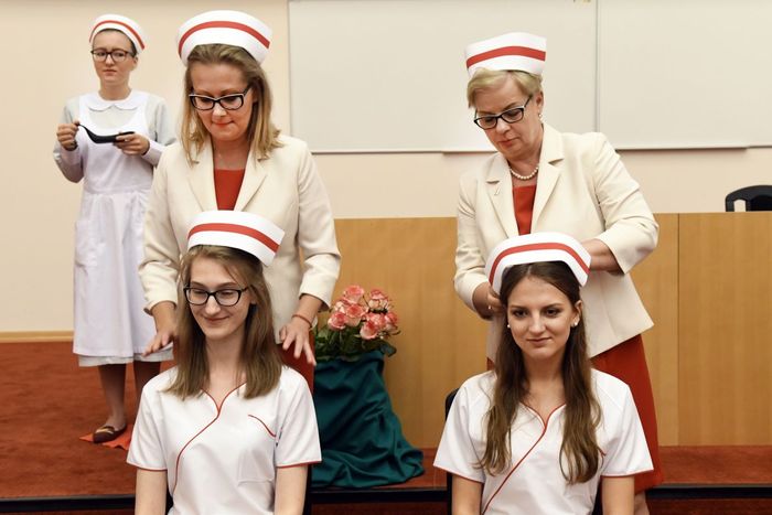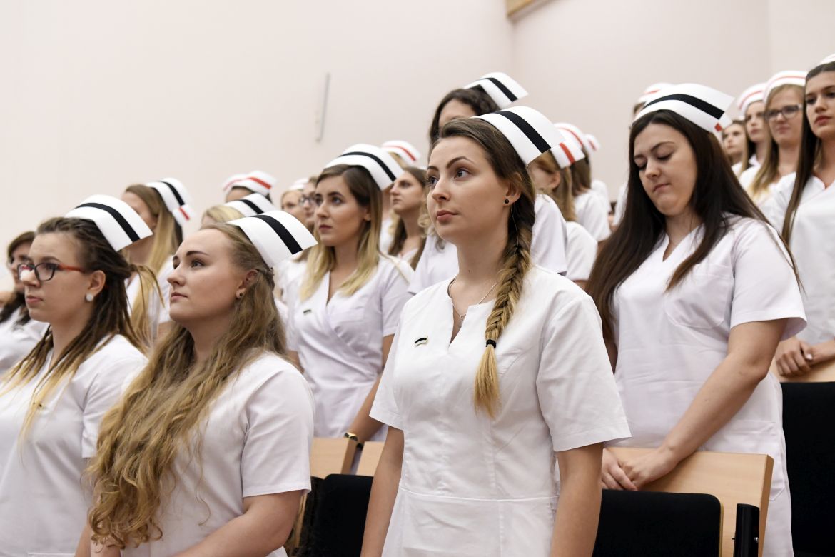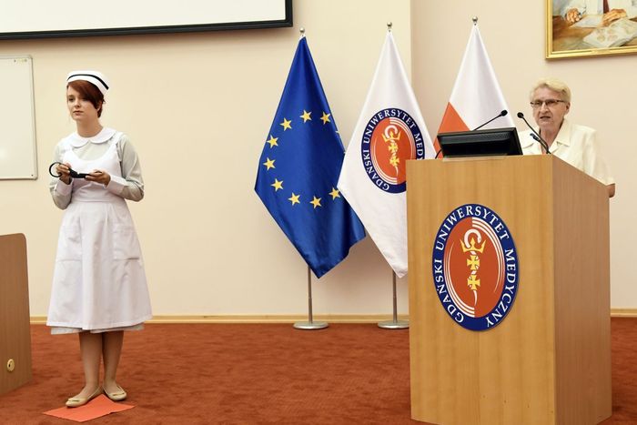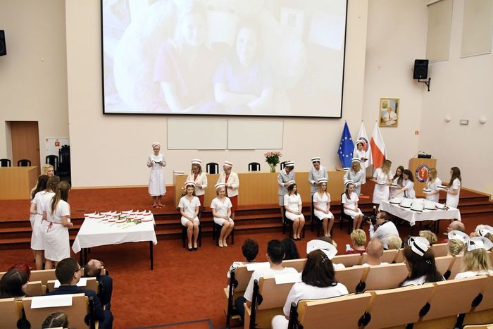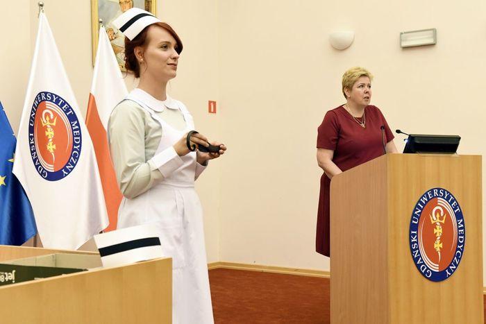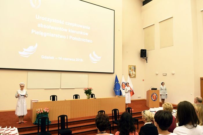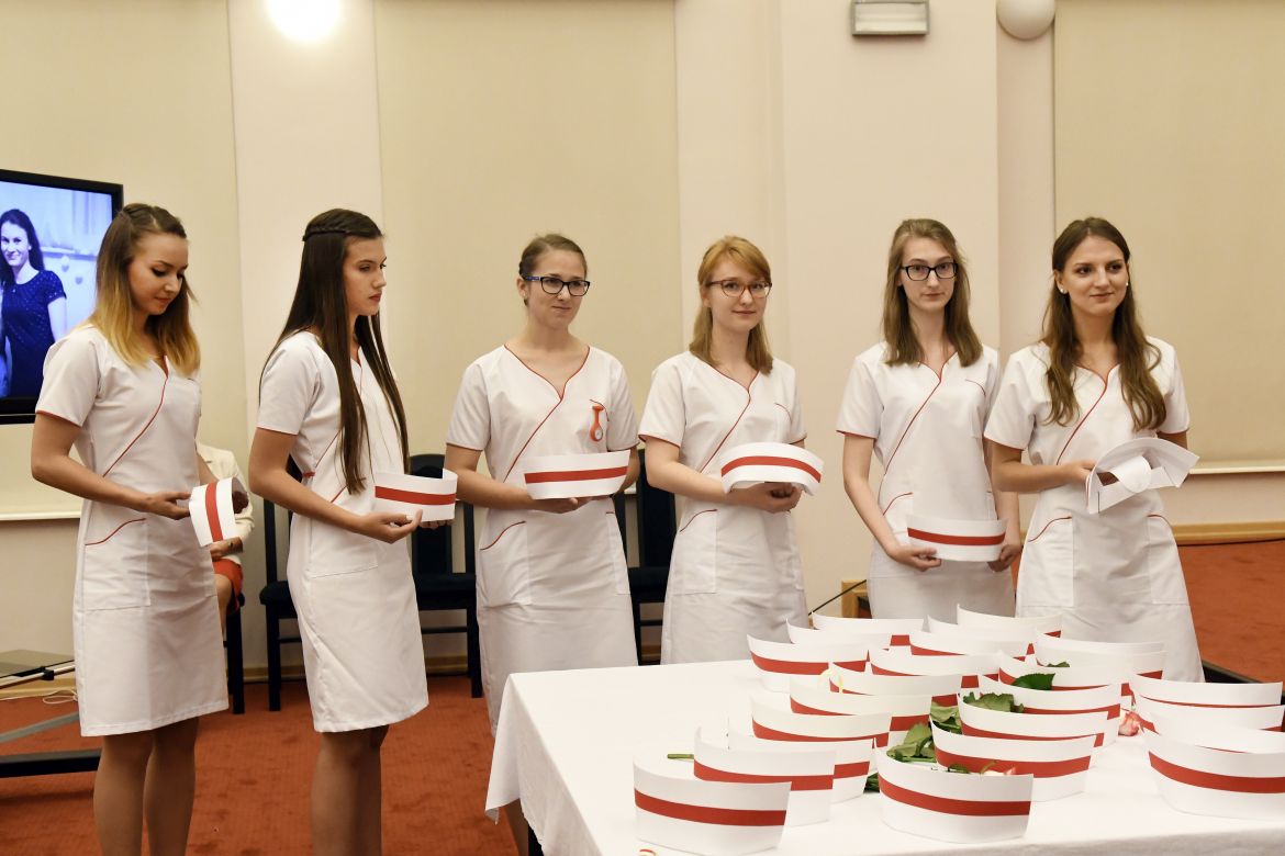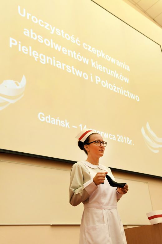 The traditional capping ceremony for the graduates of the nursing and midwife programs of the MUG Faculty of Health Sciences took place on June 14th 2018. The graduates, their families and friends, MUG authorities and staff as well as special guests (representatives of the local nursing and midwife chamber, the authorities and the University Clinical Centre authorities) gathered in the auditorium. Students wearing traditional clothing opened the ceremony by bringing lit candles to the auditorium, symbolizing the life entrusted to the care of nurses and midwifes. The caps worn by the graduates symbolize belonging to their new profession, service to people and obligation to maintain traditions of these beautiful yet difficult professions. The oath repeated by out loud by the graduates is an introduction to the Nurse and Midwife Code of Professional Ethics of the Republic of Poland.