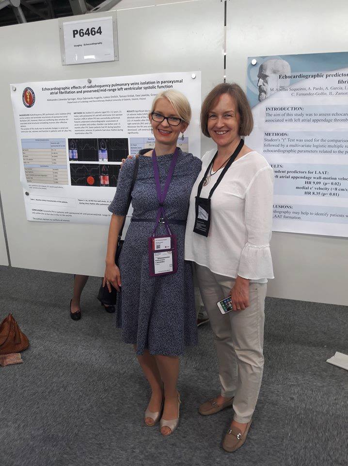 Zuzanna Lewicka-Potocka, M.D. Ph.D. student at the Department of Cardiology and Electrotherapy and Aleksandra Liżewska-Springer, resident at the UCC’s Cardiology Centre, presented results of their research projects at the European Society of Cardiology (ESC) congress, which took place in Munich, Germany. Zuzanna Lewicka-Potocka M.D. presented a poster “Right ventricular dysfunction occurs in amateur male marathon runners: a three-dimensional echocardiography examination study” and Aleksandra Liżewska-Springer presented a poster “Echocardiographic effects of radiofrequency pulmonary veins isolation in paroxysmal atrial fibrillation and preserved left ventricular systolic function”. Their work supervised Alicja Dąbrowska-Kugacka M.D. Ph.D. from the MUG’s Department of Cardiology and Electrotherapy.