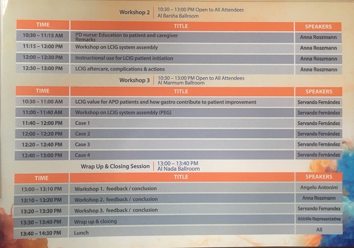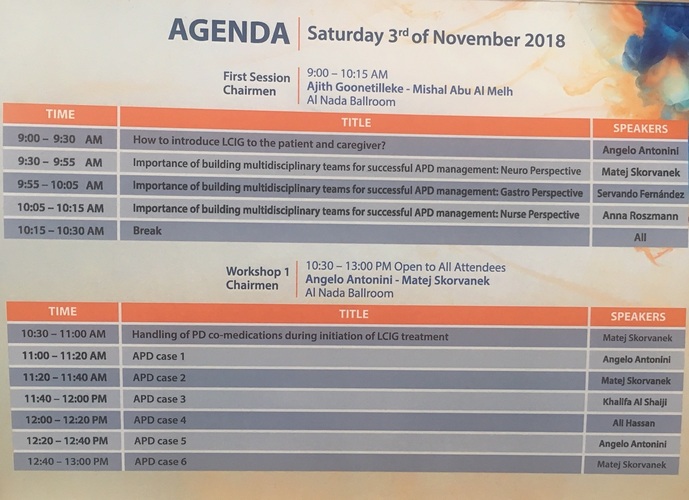 The scientific programme focused on theory-practice workshops designed for each member of the multidisciplinary team working with advanced Parkinson’s disease patients. Specific workshops for neurologists, for nurses specialized in the management of Parkinson´s pisease the content was about how to deal with the implementation and follow up of patients on LCIG-therapy and another one for gastroenterologists, where the required surgical procedure were described and cases were presented.