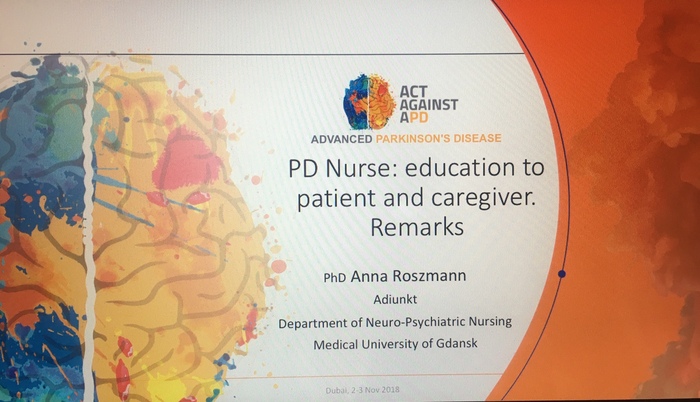 Anna Roszmann, Ph.D. from the Department of Neurological and Psychiatric Nursing took part in the 3rd edition of the educational meetings for specialists in the field of movement disorders and treatment of patients with advanced Parkinson’s disease. She was invited to present two lectures and workshop “Keep life flowing in APD management” on the implementation, care and aftercare in patients treated with Duodopa (continuous intestinal levodopa infusion). The meeting took place between November 2 and 3 in Dubai.