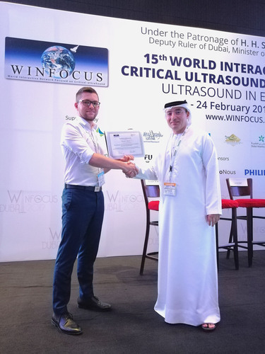 Krystian Sporysz, M.D., a doctoral student of the MUG’s Department of Anaesthesiology & Intensive Care participated in the “World Congress on Ultrasound in Emergency & Critical Care” in Dubai on February 21-24, 2019. Congress was a global gathering of practitioners from many specialties in medicine, educators, students, nurses, doctors in training, researchers, innovators, who have embraced ultrasound as an integral part of their daily practice.