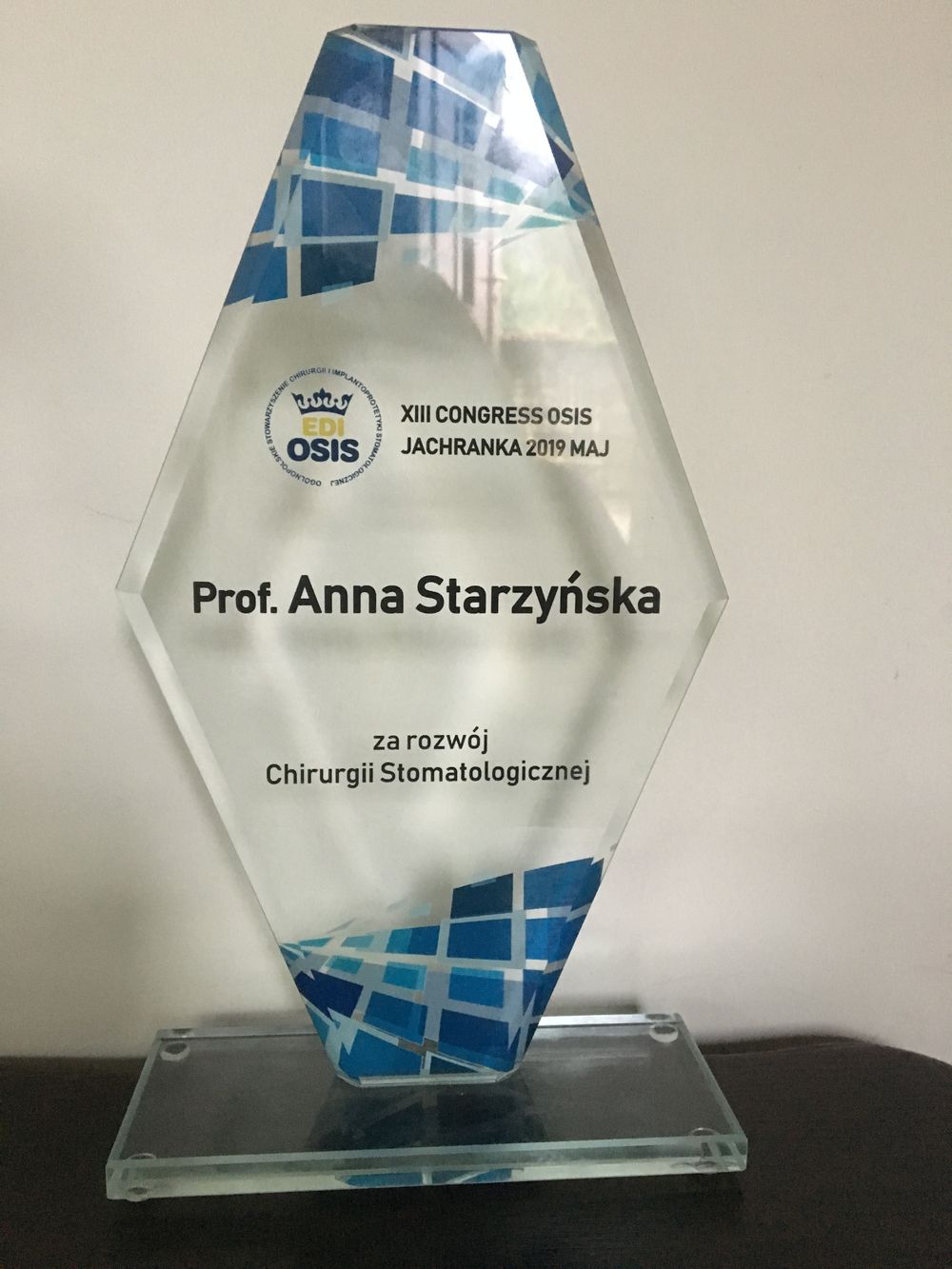 Anna Starzyńska, M.D., Ph.D., head of the Department of Oral Surgery received an award from the National Association of Surgery and Dental Implant Prosthetics (OSIS-EDI) for the effort put into the development of dental surgery. The award was given at the 13th International OSIS-EDI Congress, which took place in Jachranka on May 16-18. The theme of the Congress was devoted mainly to extensive bone augmentation, the use of platelet-rich fibrin during bone and tissue regeneration procedures, the use of lasers during around implant procedures, and the prevention and treatment of periimplantitis.