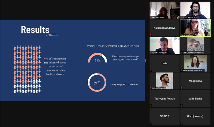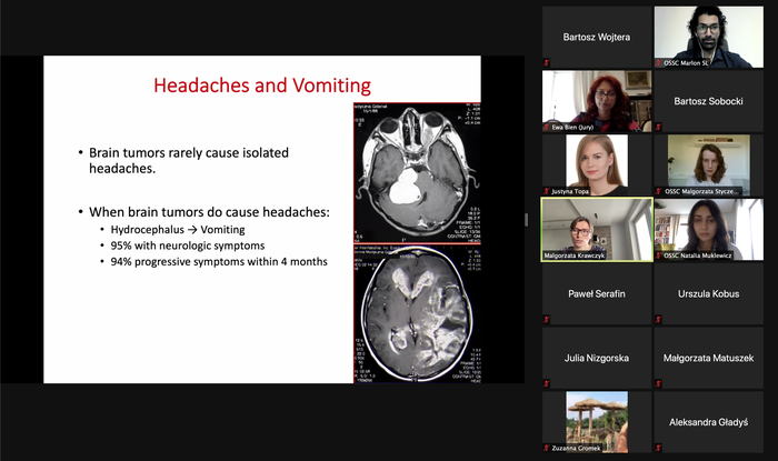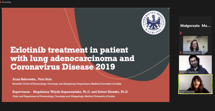 On the first day of OSSC, the participants had a chance to attend five different online workshops. The students could improve their theoretical knowledge and problem-solving skills in clinical cases interactive workshops on clinical oncology (led by Artur Bandura M.D.), pediatric oncology (Agnieszka Budka-Chrzęszczyk) and hematology (Michał Czarnogórski M.D.). Moreover, the students could also take part in doctor-patient communication workshops (Milena Lachowicz Ph.D.) and workshops on writing systematic reviews (Piotr Spychalski Ph.D.).