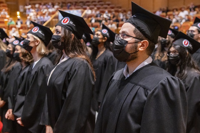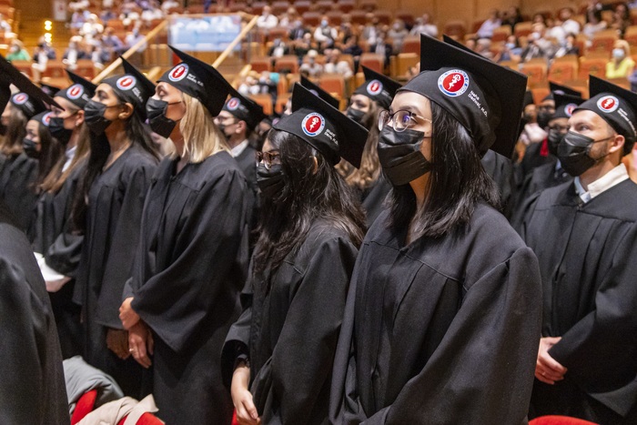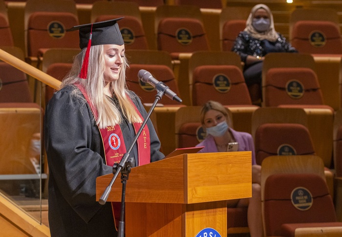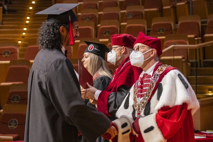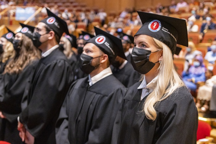 Ninety-nine alumni of 2015-2021 English Division medical studies have collected their diplomas. During the ceremony organised on 28th of June in Polish Baltic F. Chopin Philharmonic in Gdańsk Rector of the MUG Prof. Marcin Gruchała, Dean of the Faculty of Medicine Prof. Radosław Owczuk, Deputy Deans of the Faculty of Medicine: Prof. Ewa Słomińska, Prof. Paweł Zagożdżon, Assoc. Prof. Dr. Habil. Aida Kusiak, Dr. Habil. Maria Bieniaszewska and Dr. Habil. Kamil Chwojnicki as well as Assoc. Prof. Dr. Habil. Danuta Siluk, Deputy Dean of the Faculty of Pharmacy and Assoc. Prof. Dr. Habil. Anna Żaczek, Deputy Dean of the Intercollegiate Faculty of Biotechnology UG & MUG were at the presidential table. The event has been held by students’ representatives: Julia Kowalski and Marlon Souza Luis, the best foreign student in Poland, winner of this year’s edition of INTERSTUDENT contest.