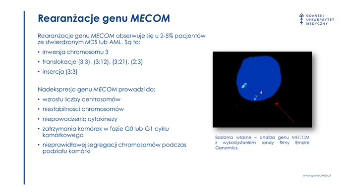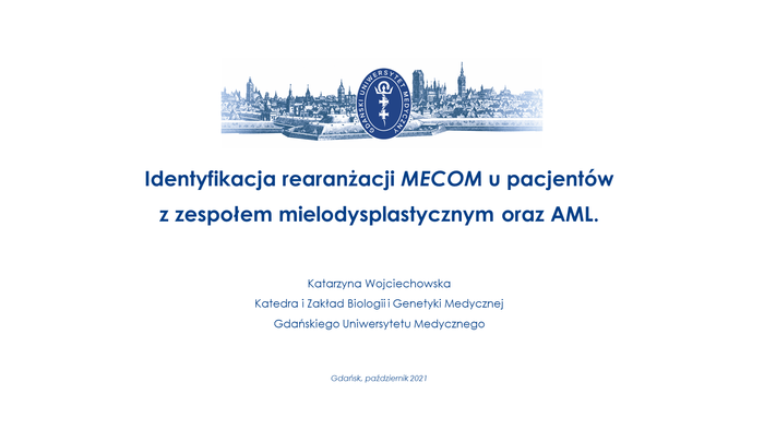A representative of the Medical University of Gdańsk Katarzyna Wojciechowska, M.A. from the Department of Biology and Medical Genetics took 2nd place in the National Competition for MA theses of medical analytics graduates, the final of which took place on 9th of May 2022 in the online form. Award-winning work entitled Identyfikacja rearanżacji MECOM u pacjentów z zespołem mielodysplastycznym oraz AML (Identification of MECOM rearrangements in patients with myelodysplastic syndrome and AML) was prepared in the Department of Biology and Medical Genetics under the leadership of the Head of the unit Prof. Bartosz Wasąg.