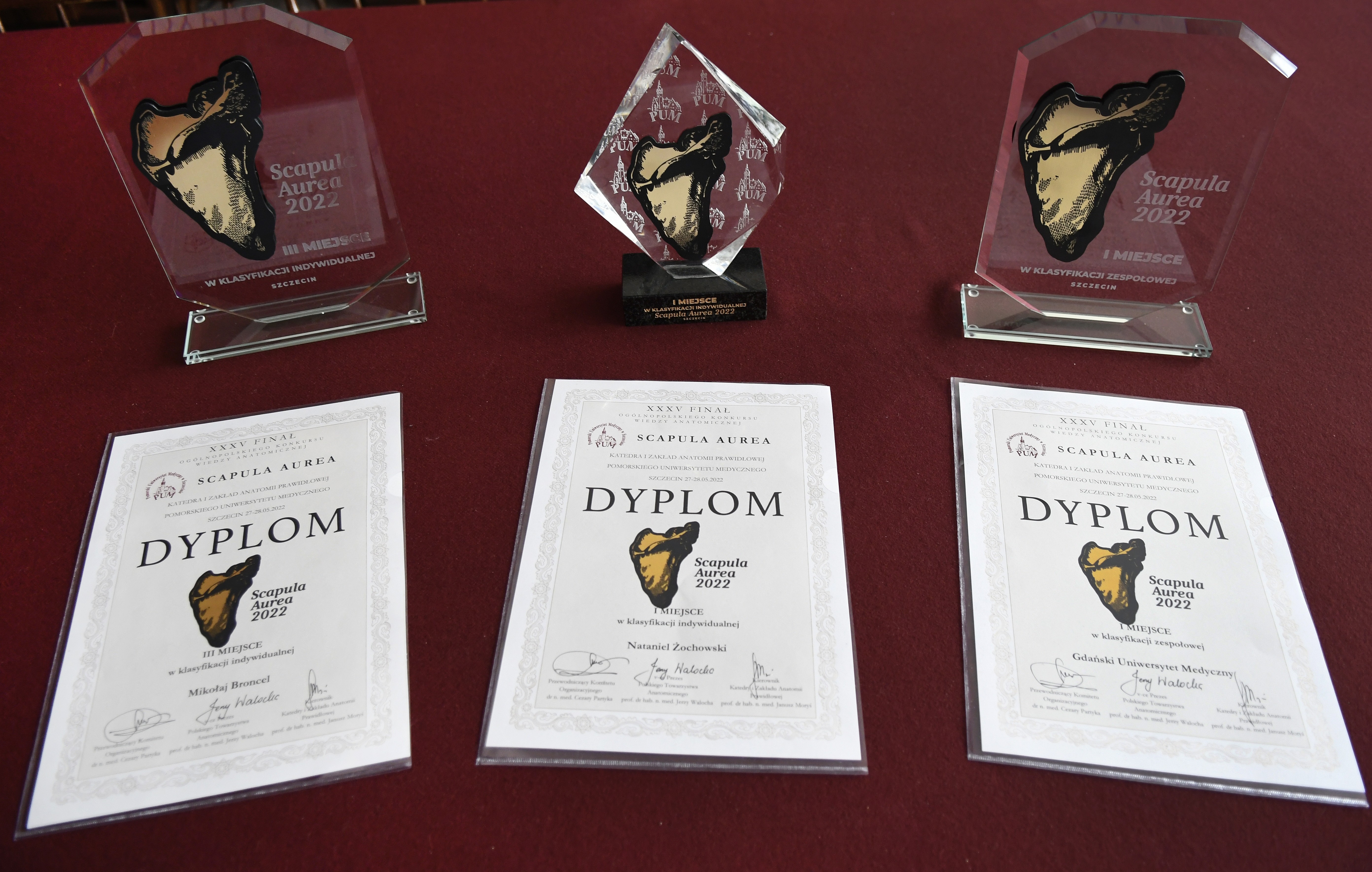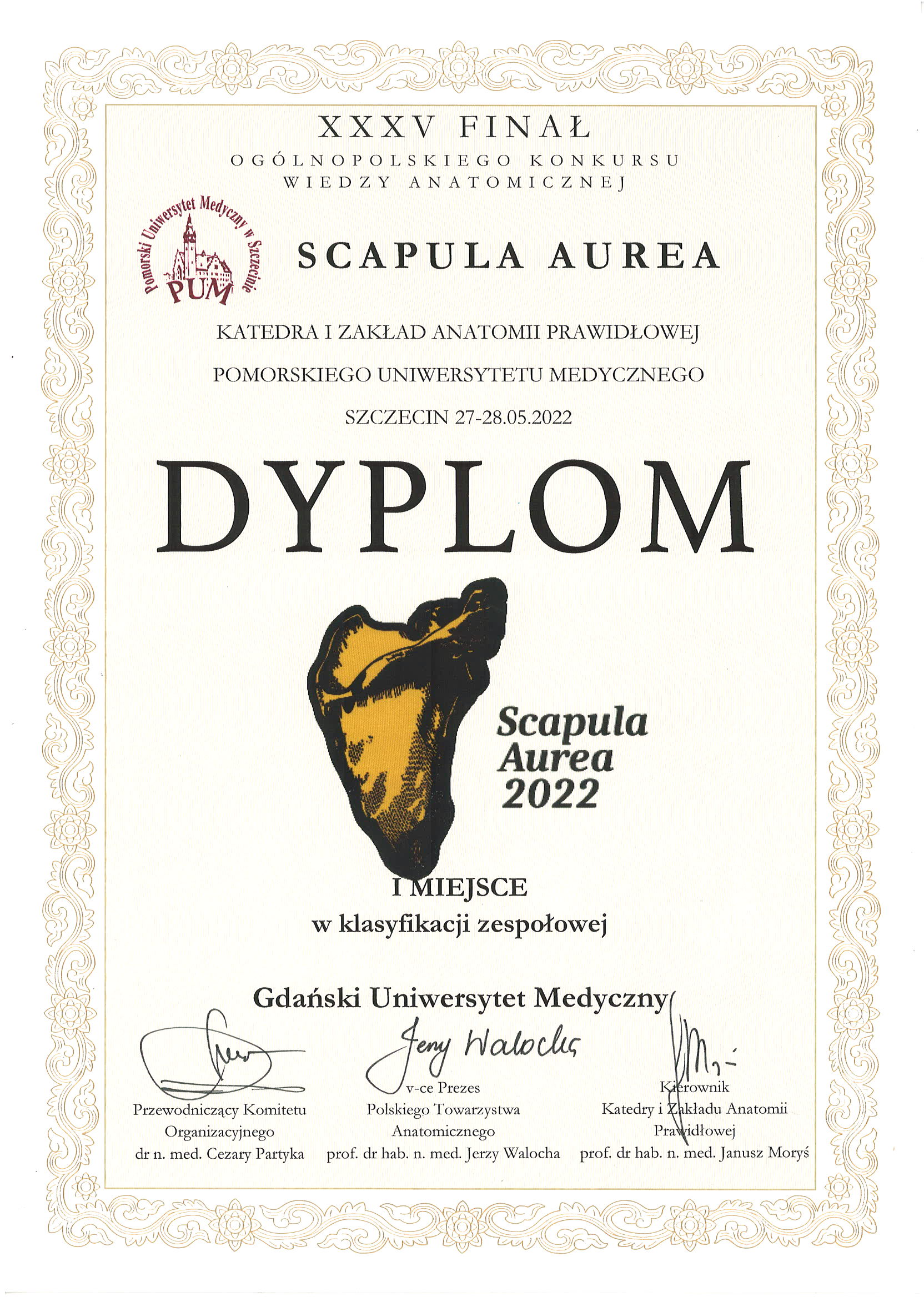 Successful students of the Medical University of Gdańsk: Helena Kamieniecka, Mikołaj Broncel, Nataniel Żochowski (1st year of medical studies) and Jesica Sarah Quizon, Jonathan Per Peterzéns, Santhanagopalakrishnan Iyer (1st year of medical – ED studies) finished their participation in this year’s edition of the anatomical knowledge contest Scapula Aurea/Golden Scapula. The organizer of the competition, which took place on 28th of May 2022 in Szczecin, was the Pomeranian Medical University. Jan Spodnik, Ph.D. from the Division of Anatomy and Neurobiology of the MUG was responsible for the preparations of the participants and the provision of care during the competition. This is another great start for our students in this prestigious competition, completed with success and places on the podium.