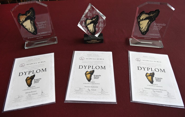 Polish representatives of our University took 1st place in the team classification of the Scapula Aurea competition, while Nataniel Żochowski triumphed individually. Mikołaj Broncel took 3rd place, and Helena Kamieniecka placed on the high 4th position. In the Golden Scapula competition, English-speaking students of the MUG took 4th place in the team classification. In total, 57 Polish- and English-speaking competitors from 11 Polish medical universities took part in the competition.