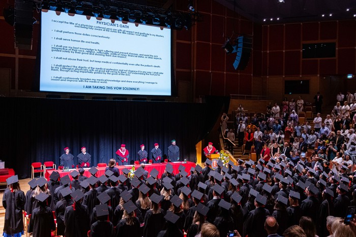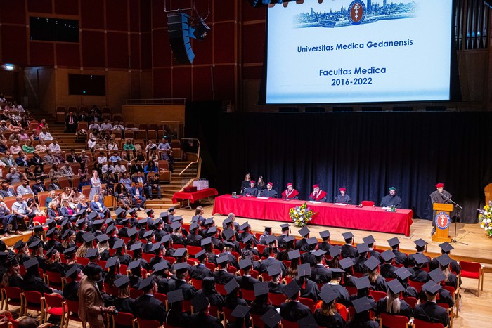 One hundred and three graduates of medical – ED studies from 2016-2022 class received their diplomas. The event was held on 24th of June 2022 at the Polish Baltic F. Chopin Philharmonic in Gdańsk. During the ceremony chaired by the Dean of the Faculty of Medicine Prof. Radosław Owczuk, attended by: MUG’s Vice-Rector for Development and Education Prof. Jacek Bigda, Deputy Deans of the Faculty of Medicine Prof. Ewa Słomińska, Prof. Aida Kusiak, Prof. Paweł Zagożdżon, Dr. Habil. Kamil Chwojnicki, as well as the Deputy Dean of the Faculty of Pharmacy Dr. Habil. Bartosz Wielgomas, Assoc. Prof. The event was hosted by graduates’ representatives Ewa Maria Sokolewicz, M.D. and Lana Ahmed, M.D.