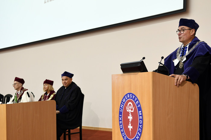More than 600 student of the Faculty of Medicine were matriculated at the ceremony held on 29 September this year. First-year students of the following faculties: medicine, dentistry and dental technology, were admitted to the Medical University of Gdańsk. The ceremony was attended by the Rector – Prof. Marcin Gruchała, Dr. Habil. Agnieszka Zimmermann, Pharm.D., Assoc. Prof. – Vice-Rector for the Quality of Teaching, Prof. Radosław Owczuk – Dean of the Faculty of Medicine, Prof. Przemysław Rutkowski – Dean of the Faculty of Health Sciences with the Institute of Maritime and Tropical Medicine and by Deputy Deans of the Faculty of Medicine: Prof. Ewa Słomińska, Dr. Habil. Maria Bieniaszewska, Dr. Habil. Aida Kusiak, Assoc. Prof., Prof. Paweł Zagożdżon, Dr. Habil. Kamil Chwojnicki. Also present were: Dr. Habil. Magdalena Prokopowicz, Assoc. Prof. – Deputy Dean of the Faculty of Pharmacy, Dr. Habil. Rafał Sądej, Assoc. Prof. – Deputy Dean of the Intercollegiate Faculty of Biotechnology UG & MUG and Jacek Kaczmarek Ph.D., representing the International Alumni Office. The event was conducted by Tomasz Kostrzewa – a doctoral student of the Department of Medical Chemistry, and supervisor of first-year medical students.