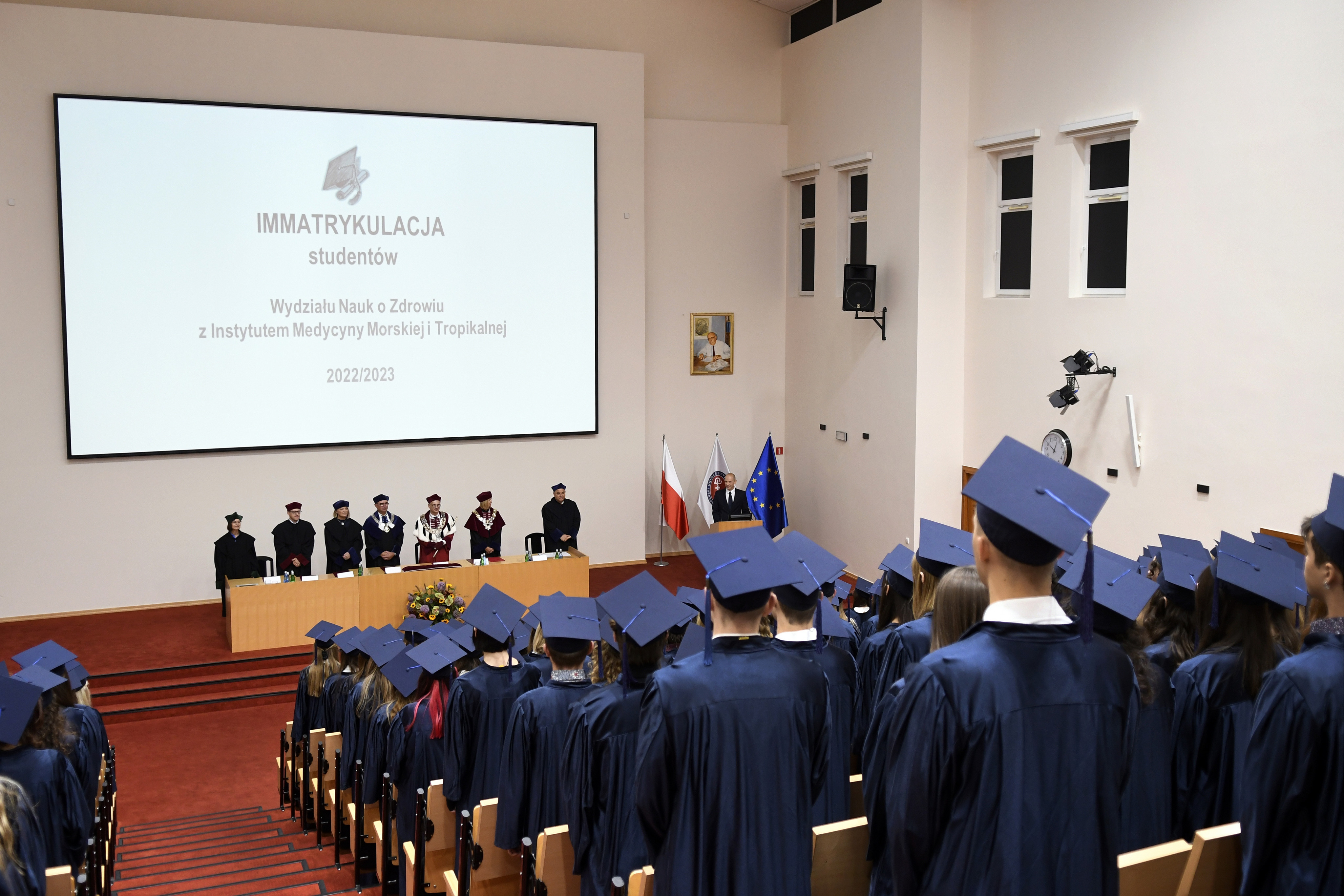 On the same day, the matriculation of over 80 English Division students also took place. This time behind the presidential table sat: Dr. Habil. Agnieszka Zimmermann, Pharm.D., Assoc. Prof. – Vice-Rector for the Quality of Teaching, Prof. Radoslaw Owczuk – Dean of the Faculty of Medicine, Prof. Przemysław Rutkowski – Dean of the Faculty of Health Sciences with the Institute of Maritime and Tropical Mediciney nd Deputy-Deans of the Faculty of Medicine: Prof. Ewa Słomińska, Dr. Habil. Maria Bieniaszewska, Prof. Aida Kusiak, Prof. Paweł Zagożdżon, Dr. Habil. Kamil Chwojnicki and Dr. Habil. Bartosz Wielgomas – Deputy Dean of the Faculty of Pharmacy. Jacek Kaczmarek Ph.D. – International Alumni Relations Officer, a member of the Alumni Association of our University was also present. The entire meeting was chaired by Narcyz Knap, Ph.D. from the Department of Medical Chemistry, supervisor of first-year medical ED students.