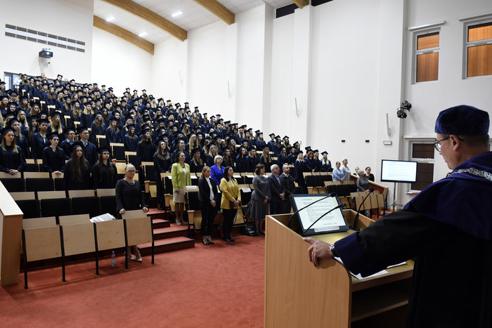 First-year students of the following faculties have been officially admitted to the Medical University of Gdańsk: Dietetics, Electroradiology, Physiotherapy, Nursing, Midwifery, Health Psychology, Medical Rescue, Public Health – Management in the Health System, and Environmental Health. More than 500 students were admitted to the Faculty of Health Sciences with the Institute of Maritime and Tropical Medicine at the MUG. Due to a large number of participants, the ceremony was held in two rounds in Prof. Olgierd Narkiewicz Hall, AGN. The matriculation was conducted by Damian Wnuk from the Division of Physical Therapy at the MUG.