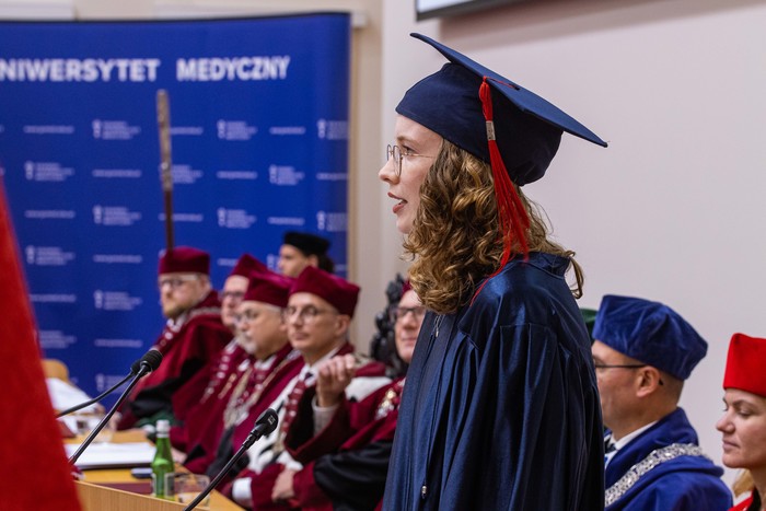 Nearly 1,400 first-year students joined the academic community of the MUG, who was solemnly welcomed by Dr. Habil. Tomasz Smiatacz, Vice-Rector for Student Affairs. The deans of the various faculties presented the students with congratulatory letters, while the Rector, Prof. Marcin Gruchała, belted them and accepted them as students of our University. The oath of doctoral students was conducted similarly, with Prof. Jacek Witkowski, Director of the First Doctoral School of the MUG, taking part. Student representative Małgorzata Styczewska, M.D. and chairwoman of the Doctoral Student Government Gabriela Harasim, M.Sc. also spoke, addressing a few words to their younger colleagues.
