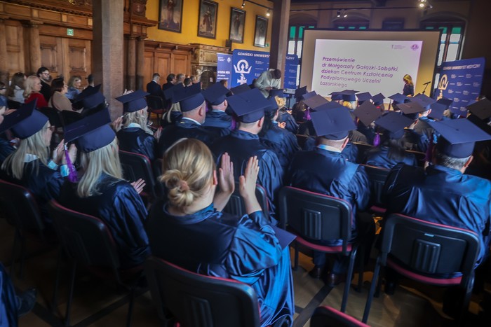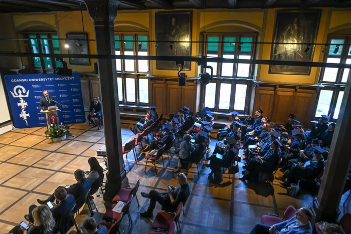 The ceremony took place in the bourgeois hall of the Old Town Hall in Gdańsk. It was attended by representatives of the authorities of partner units: Prof. Jacek Bigda, Vice-Rector for Development and Education of the MUG, Prof. Michał Markuszewski, Vice-Rector for Science of the MUG and co-hosts of the diploma ceremony at Lazarski University, with which the Medical University of Gdańsk created MBA studies for the health care sector – Rector Prof. Maciej Rogalski and the Dean of the Postgraduate Education Centre and the director of the Institute of Healthcare Management at Lazarski University – Małgorzata Gałązka-Sobotka, Ph.D. Also present were Tadeusz Jędrzejczyk, Ph.D., Director of the Health Department of the Pomeranian Voivodeship Marshal’s Office and Jerzy Karpiński, Director of the Health Department of the Pomeranian Voivodship Office. There were also lecturers and people accompanying the graduates.