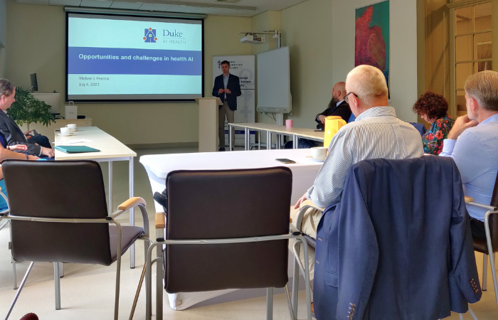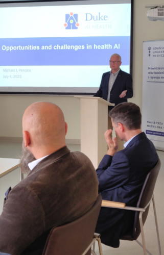 The application of artificial intelligence in medicine was the topic of an open lecture given on 4 July by one of the leaders in this field in the US – Professor Michael Pencina – Dean of Data Science and Director of Artificial Intelligence Health, Duke University. Professor Pencina gave a lecture entitled Artificial Intelligence in Medicine – Opportunities and Threats. An American perspective at the Medical University of Gdansk at the special invitation of Professor Tomasz Zdrojewski, Head of the Division of Preventive Medicine & Education, member of IDUB PRA 2, and coordinator of Research Team I. Epidemiology and registries.