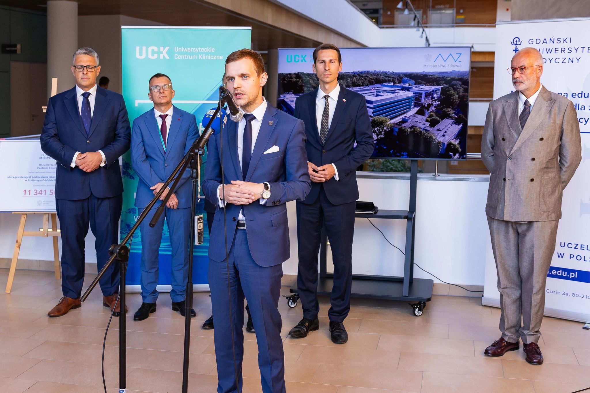 The University Clinical Centre complex in Gdańsk will be expanded with a new space where the youngest hospital patients will recover. The Pediatric Medicine Centre will be a significant expansion of diagnostic and treatment options for children not only from the region, but also from all over the country. The contract was signed on 22nd of September 2023 at the Non-Invasive Medicine Centre. The event was attended by: Prof. Marcin Gruchała – Rector of the Medical University of Gdańsk, Prof. Piotr Czauderna – Head of the Department of Surgery and Urology for Children and Adolescents of the Medical University of Gdańsk, Chairman of the Health Protection Council of the President of the Republic of Poland, Marcin Martyniak – Undersecretary of State at the Ministry of Health, Deputies to the Sejm of the Republic of Poland – Kacper Płażyński and Jarosław Sellin. The University Clinical Centre in Gdańsk was represented by Jakub Kraszewski – General Director and Arkadiusz Lendzion – Deputy Director for Administration and Technology.