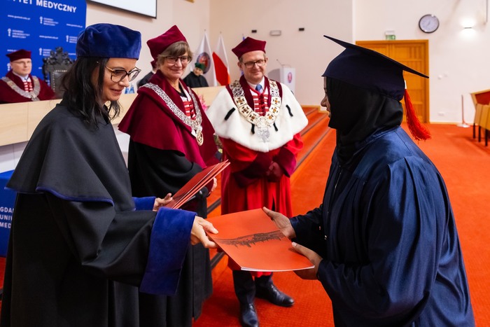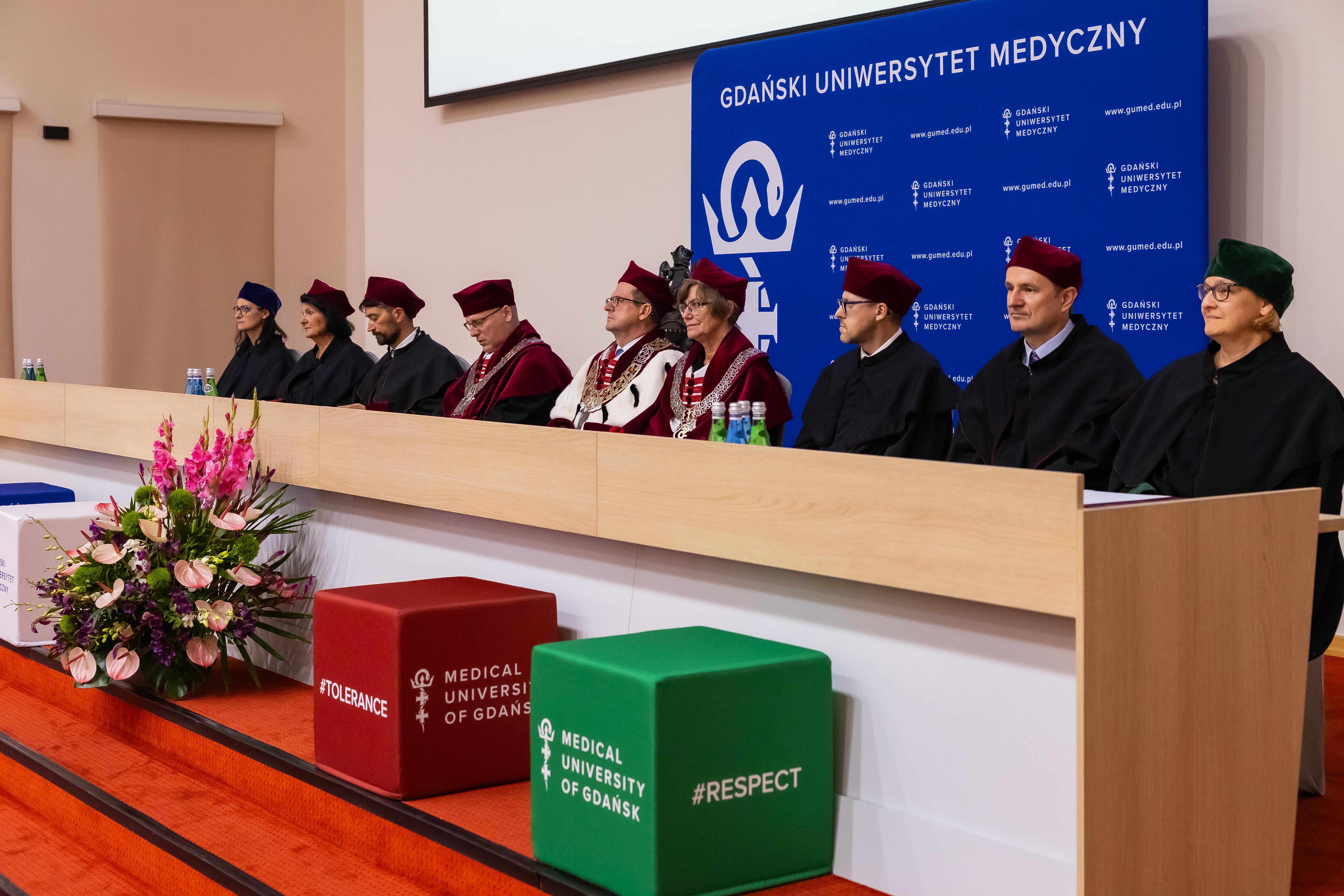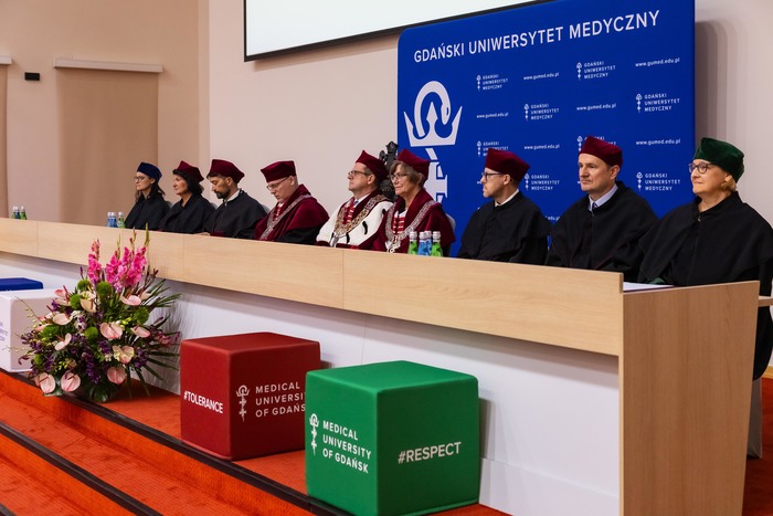 The ceremony was attended by: Prof. Michał Markuszewski – Rector of the MUG, Prof. Michał Żmijewski – Vice-Rector for Science, Assoc. Prof. Dr. Habil. Maria Bieniaszewska – Dean of the Faculty of Medicine and Vice-Deans of the Faculty of Medicine: Prof. Aida Kusiak, Dr. Habil. Kamil Chwojnicki, Dr. Habil. Tomasz Marjański, Dr. Habil. Jarosław Jendrzejewski and Assoc. Prof. Dr. Habil. Danuta Siluk – Vice Dean of the Faculty of Pharmacy and Dr. Habil. Ewa Bandurska – Vice-Dean of the Faculty of Health Sciences with the Institute of Maritime and Tropical Medicine. Dr. Habil. Sławomir Wójcik – head of the Admissions Office was also present. The entire meeting was chaired by Narcyz Knap, Ph.D. from the Department of Medical Chemistry, supervisor of the first-year of medical ED students.