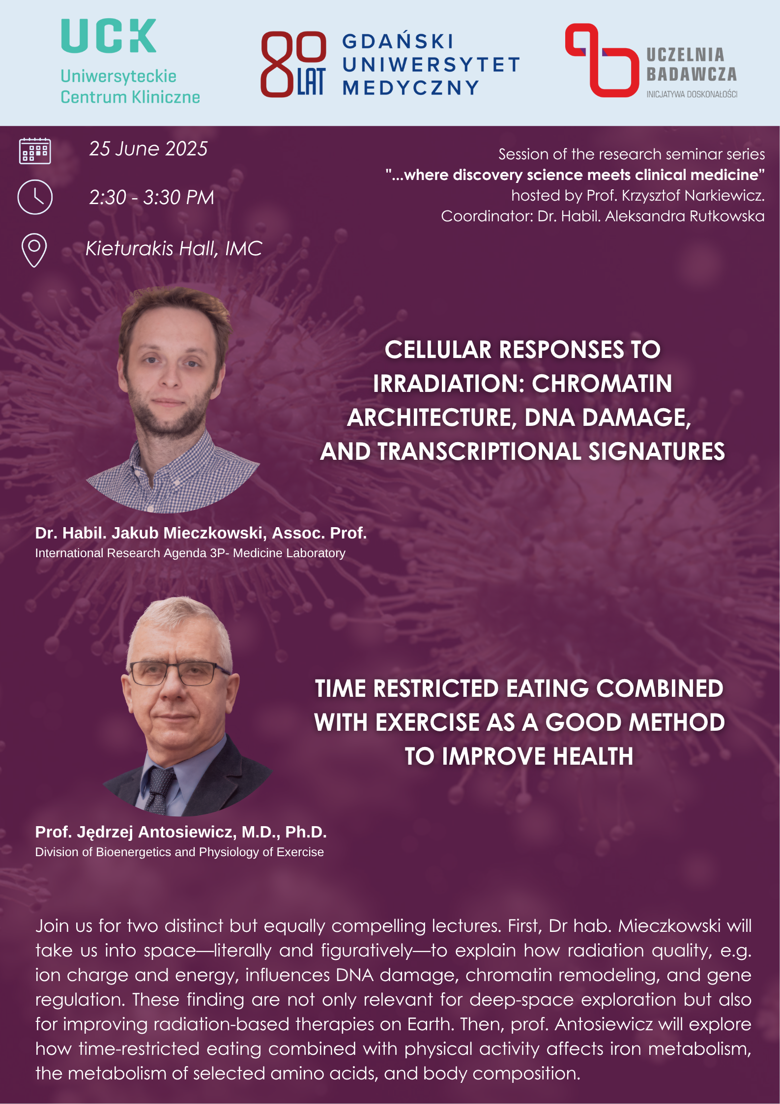 - Cellular Responses to Irradiation: Chromatin Architecture, DNA Damage, and Transcriptional Signatures – Dr. Jakub Mieczkowski, D.Sc., Associate Professor