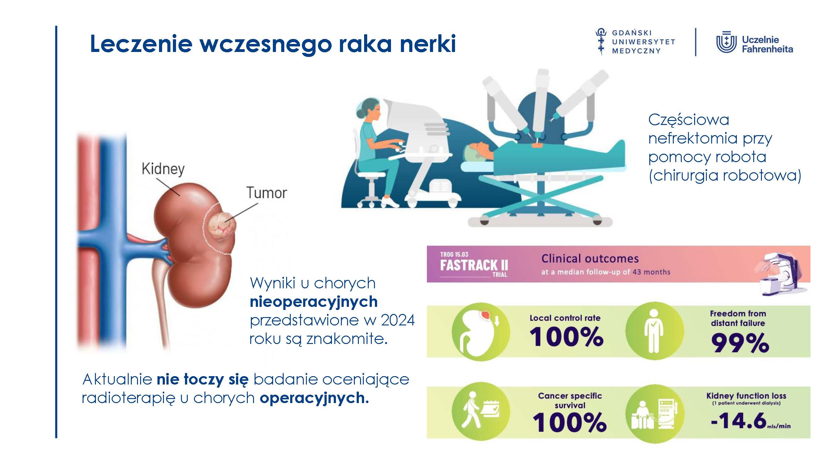 The aim of the RAPSTAR trial is to compare the effectiveness of robotic surgery and stereotactic radiotherapy in patients with early-stage kidney cancer who qualify for surgical treatment. The study seeks to determine which method better preserves renal function while ensuring effective cancer control and maintaining a high quality of life. RAPSTAR is a pioneering initiative – no direct comparison between these two methods in operable patients has been conducted to date.