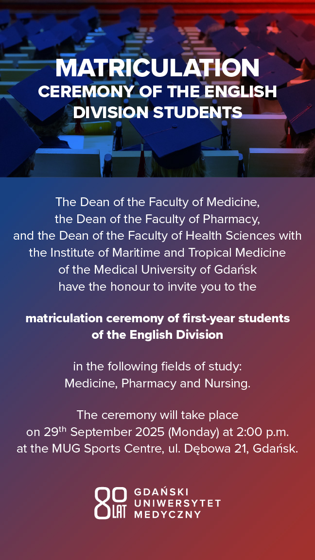 The Dean of the Faculty of Medicine, the Dean of the Faculty of Pharmacy, and the Dean of the Faculty of Health Sciences with the Institute of Maritime and Tropical Medicine of the Medical University of Gdańsk have the honour to invite you to the matriculation ceremony of first-year students of the English Division in the following fields of study: Medicine, Pharmacy and Nursing.